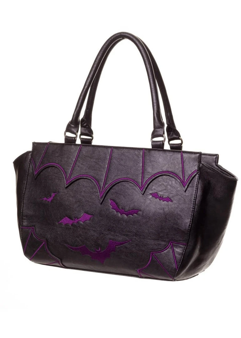 They’re embroidered all over the front, in a mysterious purple… With her width of 31 cm width, she’s nicely spacious: big enough for all your essentials, like a tablet, your phone and a small bottle of water. On the inside, there are 3 compartments, one of which closes with a zipper, plus an additional zipper pocket on the back. She’s made of a high quality faux-leather.