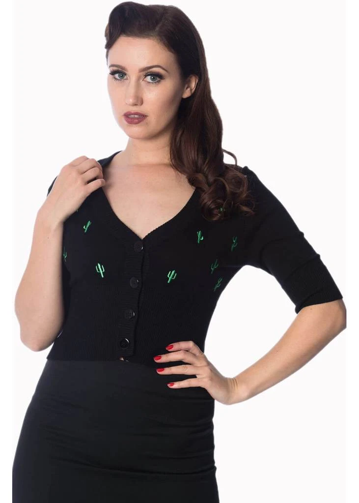 Dit schatje is gemaakt van een stretchy viscose mix, waardoor ze draagt als een droom. Met haar v-hals en gladde knopen geeft ze een gelikte vintage look, terwijl ze gewoon heel praktisch is! De randen bij de hals, mouwen en onderkant zijn geribbeld, voor een prachtige pasvorm. Dit kortere modelletje komt tot ongeveer in de taille, perfect dus om te combineren met al die leuke jurkjes en rokken!