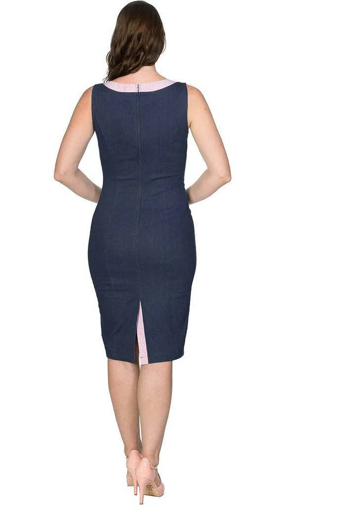 Her denim look is a mix of cotton and has a lovely stretch. Perfect for wearing when you’re eating at a picnic, or at a rockabilly party of course, because with her gingham accents she’s stunning anywhere. This cutie is beautifully formfitting because of her princess seams, down from which she continues into a Vavavoom pencil skirt which with a height of 1,70 reaches down to the knee. She closes with a zipper on the back.