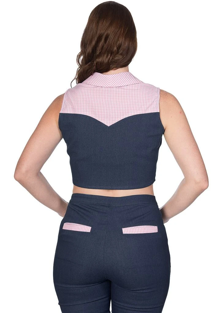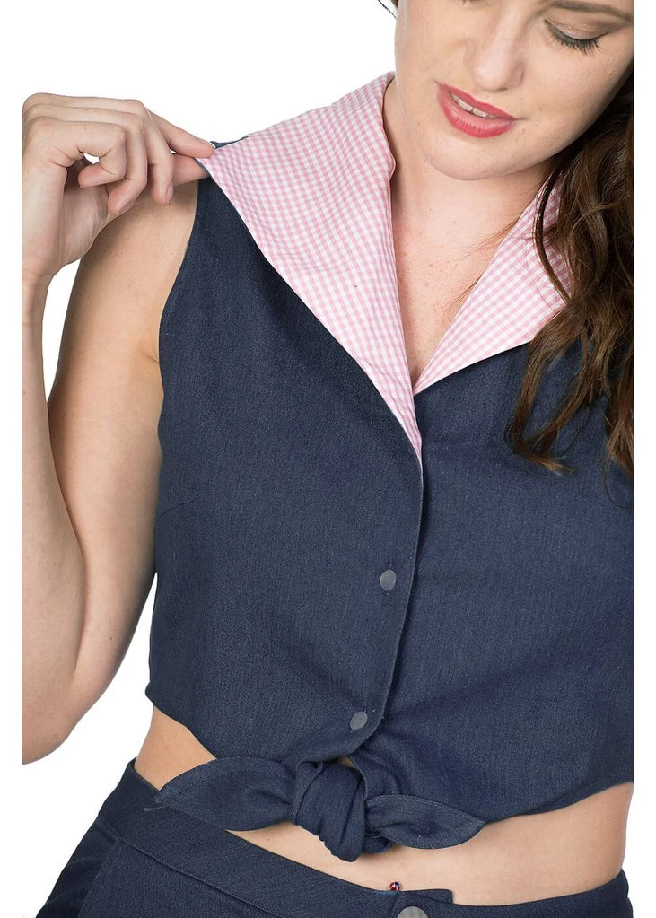 Her denim look is a mix with cotton and has a nice stretch. Which makes her perfect for eating at a picnic or at a rockabilly party of course, because with her gingham accents she’s stunning anywhere! She closes with padded buttons across the front.