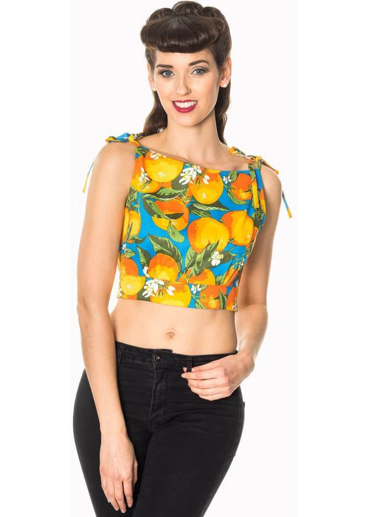 Deze Lane Way top is de kortste van onze Sinaasappel manie! Dit schatje is gemaakt van katoen met lichte stretch en heeft print van felgekleurd fruit. De schouderbandjes knoop je in een vrolijke strikjes, terwijl je de top s;luit met knoopjes aan de achterkant.
