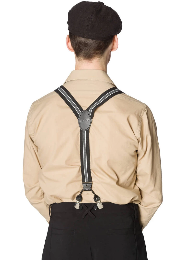 These braces are 35 mm wide, perfect for standing out, and for being comfortable. They’re adjustable and made of a firm elastic with a great stretch, so they nicely stay in place. They click with two clips on the front and two in the back. Across the back they cross and come together with a faux-leather Banned detail pressed in.