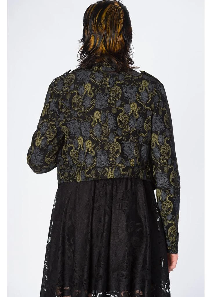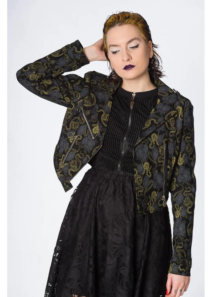 Trust us, you don’t have a biker jacket like this yet and you need it 😉 This stunning print of snakes and flowers adds a second look-worthy appearance… The shorter model is tailored, which is emphasised by the button underneath the a-symmetrical zipper with which you close her. She has a zipper pocket, and a faux pocket. She’s made of a firm yet stretchy fabric that feels like bengaline which feels lovely to wear and looks vavavoom!