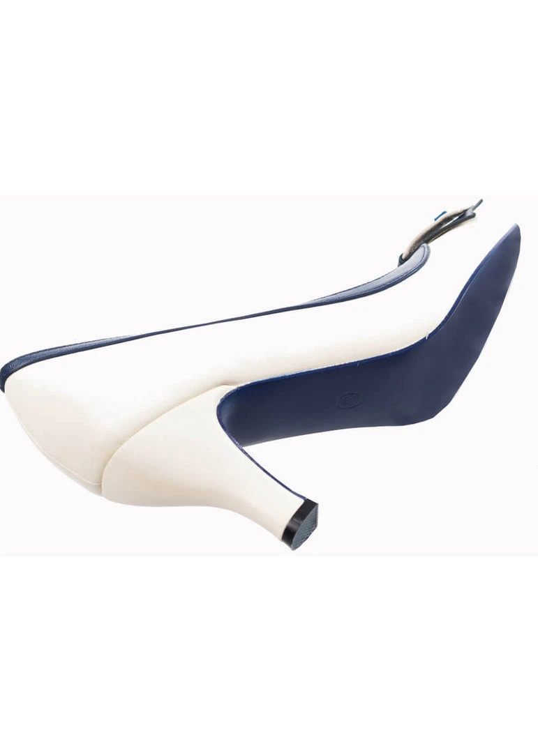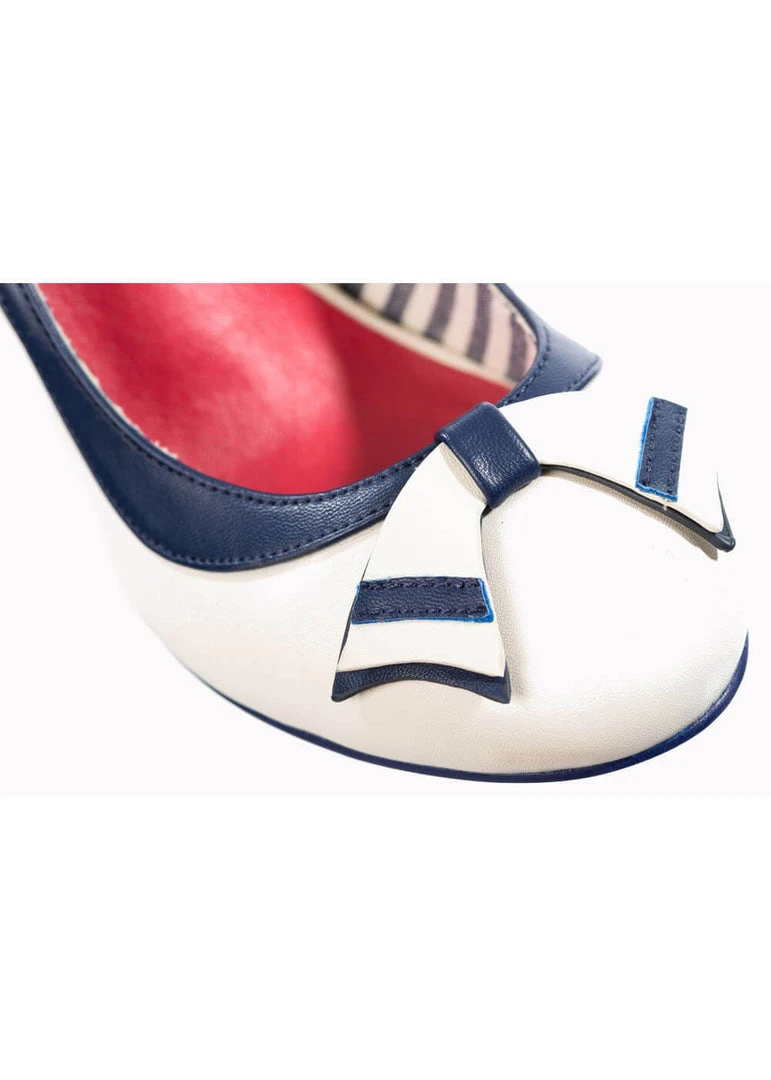 Deze beauty’s hebben een speelse jaren ’60 look door een het nautical detail op de neus en is gemaakt van een mooie kwaliteit kunstleder. Met de licht gebogen hak die met 6,5 cm niet al te hoog is loopt ze heerlijk, al helemaal met dat zachte voetenbed en katoenen voering. Dit fijne modelletje is geschikt voor bredere voeten.