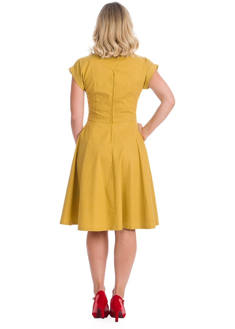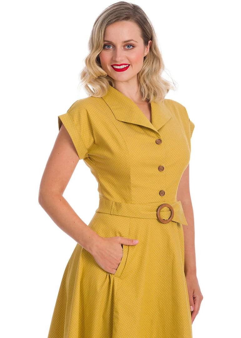 She’s so lovely lightweight and nicely dotted with her fine cotton mix with slight stretch! Her wide collar and rolled-up short sleeves make for the perfect vintage shirt-look.