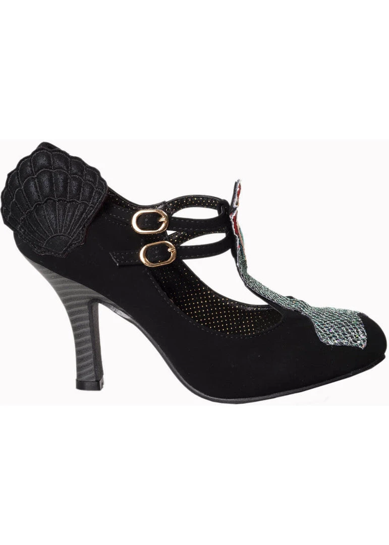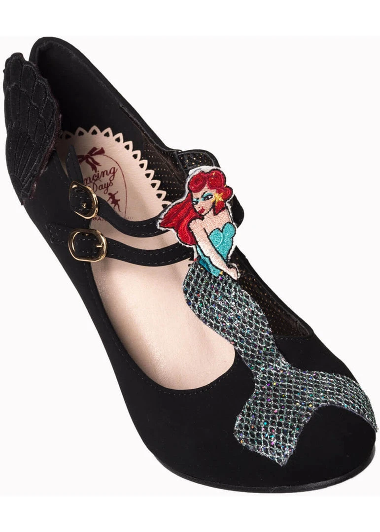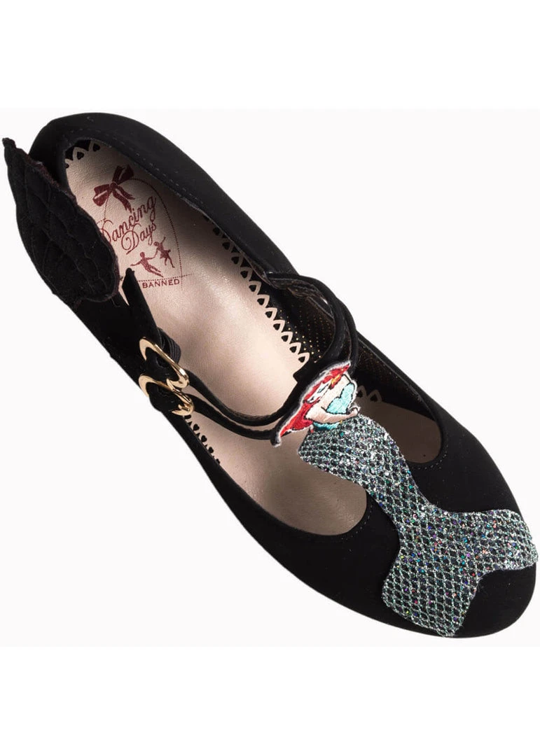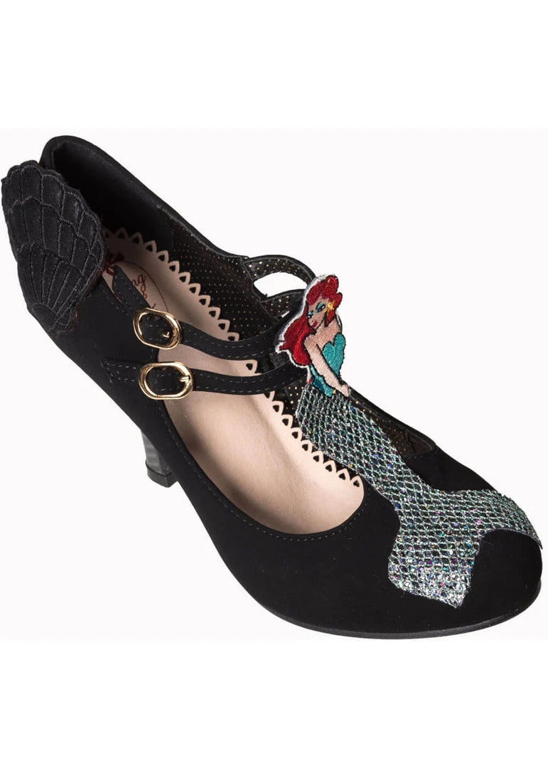 Zo’n naam zegt zoveel en toch kon je dit niet verwachten… Deze pump heeft een t-bandje met daarop een heuse zeemeermin! Het haar vuurrood en een vin die heerlijk glanst. Het zwart van het schoentje zelf maakt deze beauty dan weer wat makkelijker te combineren, zodat je er elke dag van kan genieten. De zijkant is versierd met een zeeschelp.