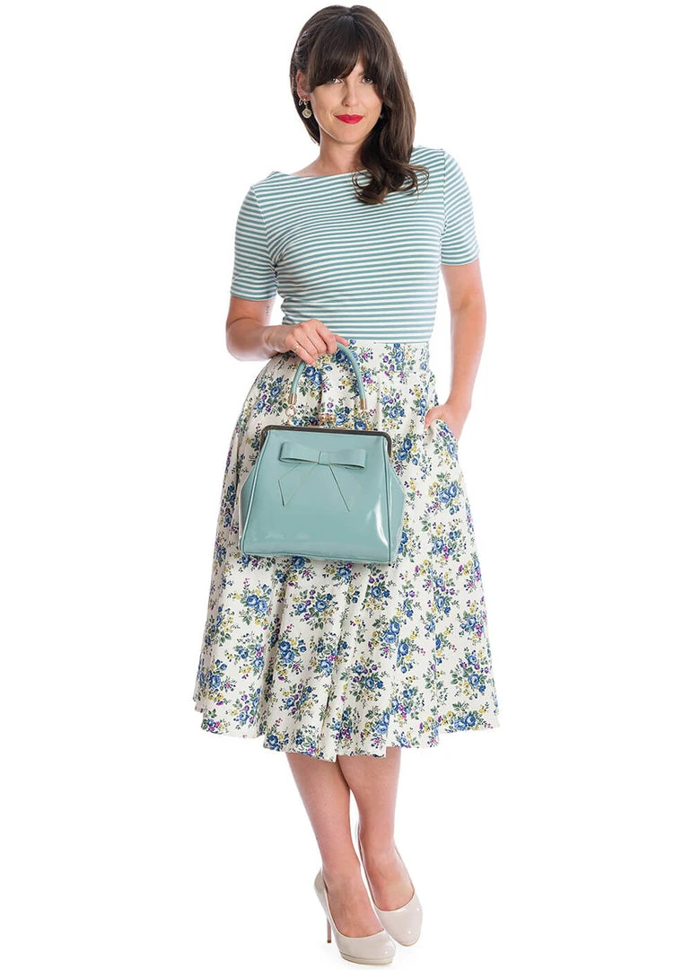 This gem has a classic 50’s silhouette and flares elegantly from the waist into a lovely skirt with pockets. To make those flowers bloom, you can wear her with one of our petticoats!