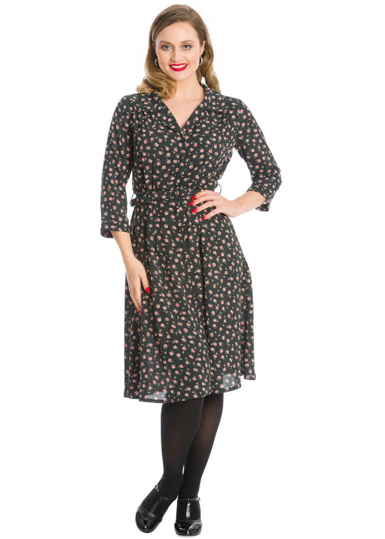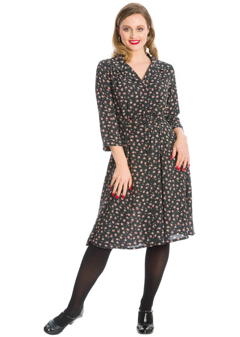The bodice is adorned with a collar and smooth buttons until the waist. The flat pleats at the shoulders as well as above and underneath the waist make for a perfect 40’s look. The waist is accentuated by the removable belt, from where she flares into an elegant A-line skirt with pockets. She closes with a zipper in the back and falls on the knees for a height of 1,70 m.