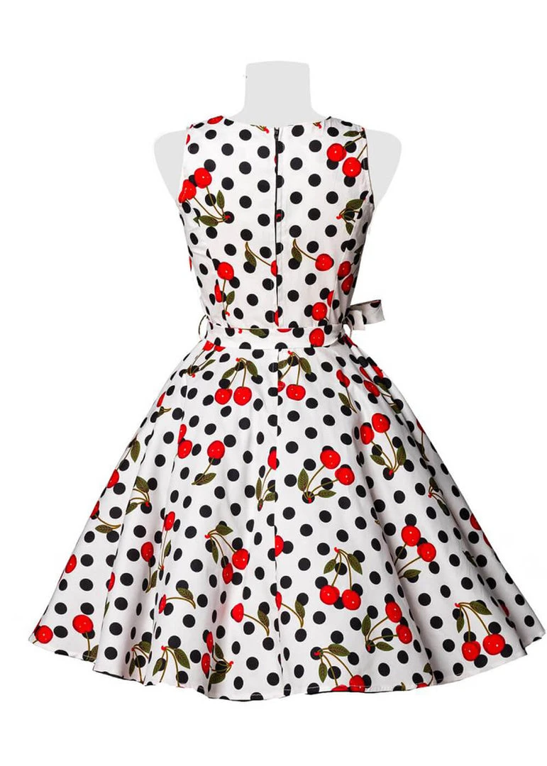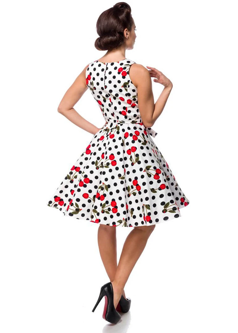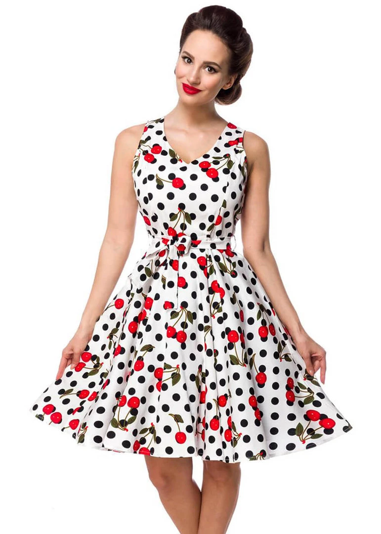 Your eyes won’t know where to look first: the seductive v-neck, the shiny cherries on the background of breathable cotton with polkadots or the cute bow in the waist? The princess seams, together with the slight stretch, make for a stunning fit and a VaVaVoom silhouette.