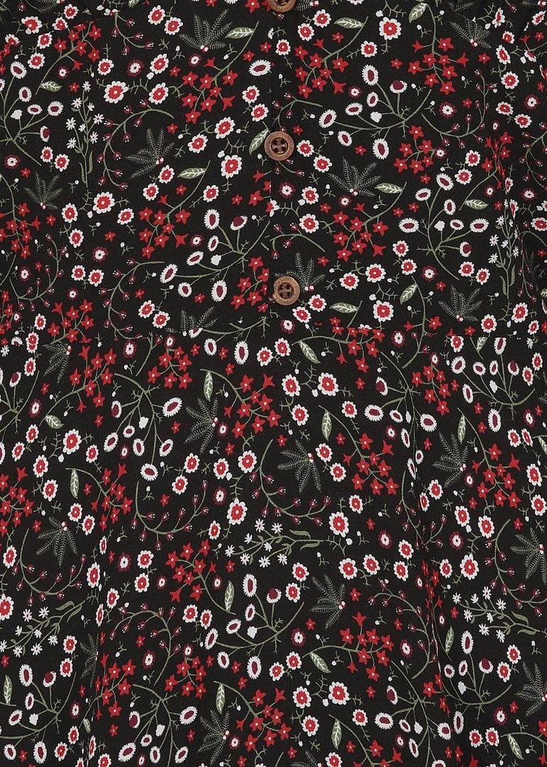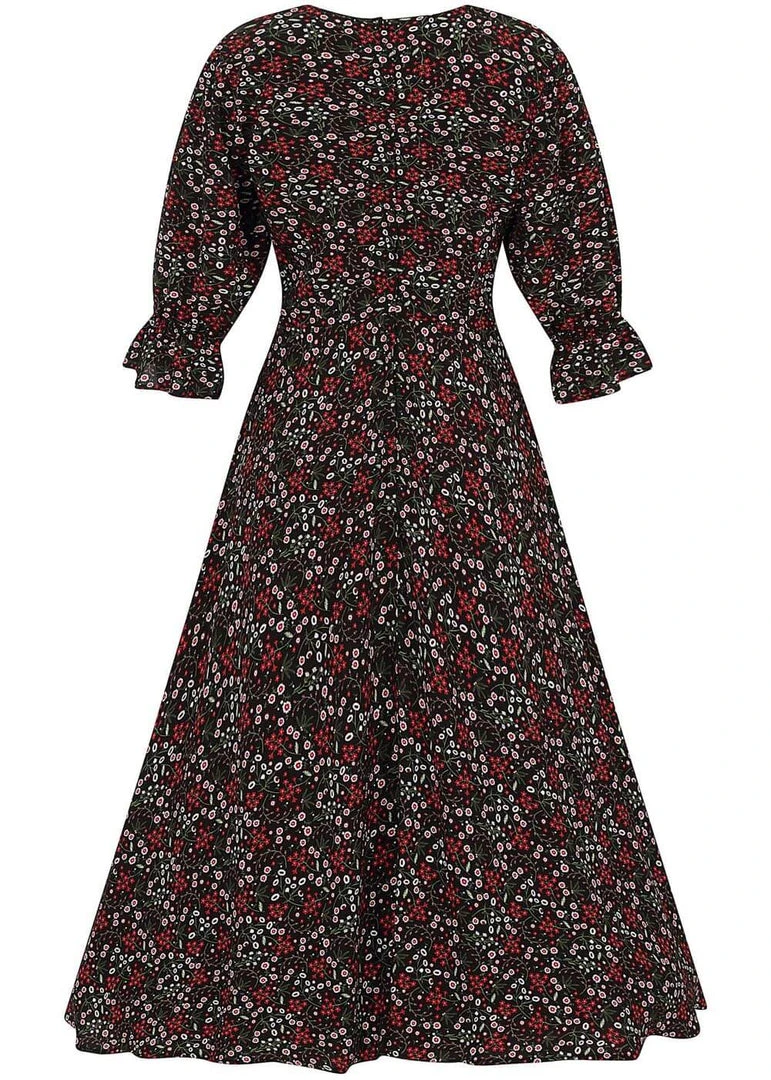 In the woods or snuggly on the couch, Hayden is the perfect boho-chic dress with her wooden decartive buttons and the v-neck! Her half-long sleeves are playfully puffy because of the smocked ends. Her 100% rayon without stretch is so light to wear, the tender flower pattern seems to fly off it! From the seam by the waist, she flares until around halfway down the calves for a height of 1,70 m and she closes with a zipper in the back.