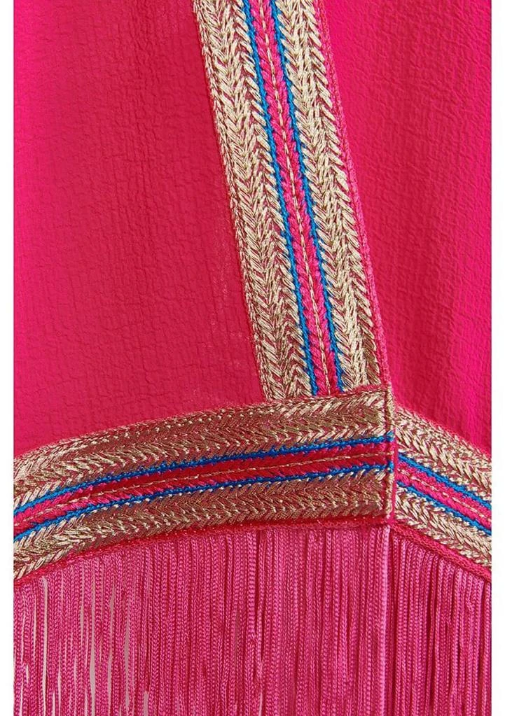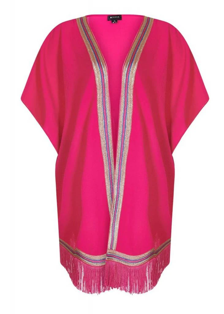 Deze schitterende kimono is prachtig stofje dat voelt als crêpe in een niet-te-missen roze! De rand is spectaculair met haar goud en blauw trim. Alleen al over een topje met palazzo broek (of badbak dus!) heb je een outfit om van te kwijlen, en ook boven veel jurken is ze absolutly stunning… De onderkant van dit losse model is opgeleukt met fringe voor een feestelijk 70’s (of 20’s) effect.