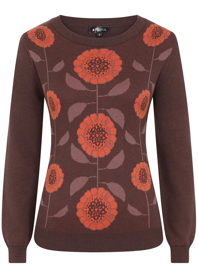 This cutie is nicely warm and adorably floral, and the combination of the big orange flowers with the brown background make for a fun 60’s or 70’s look.
