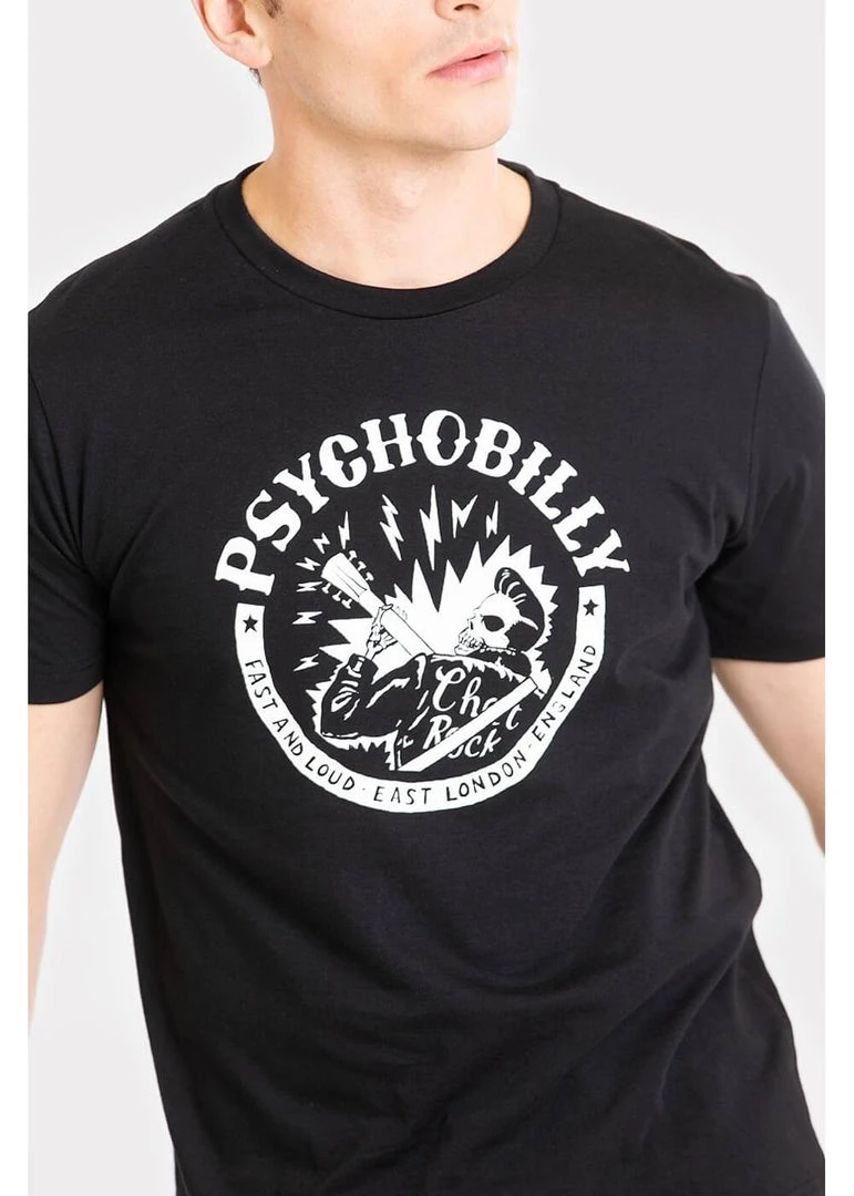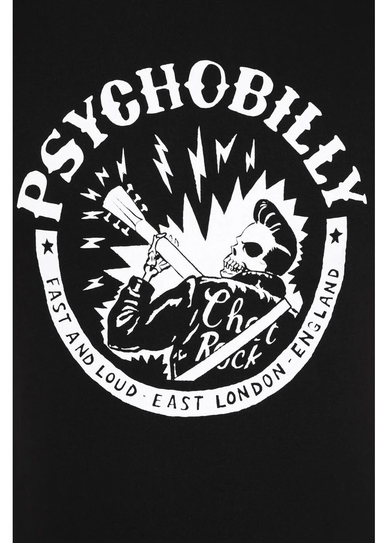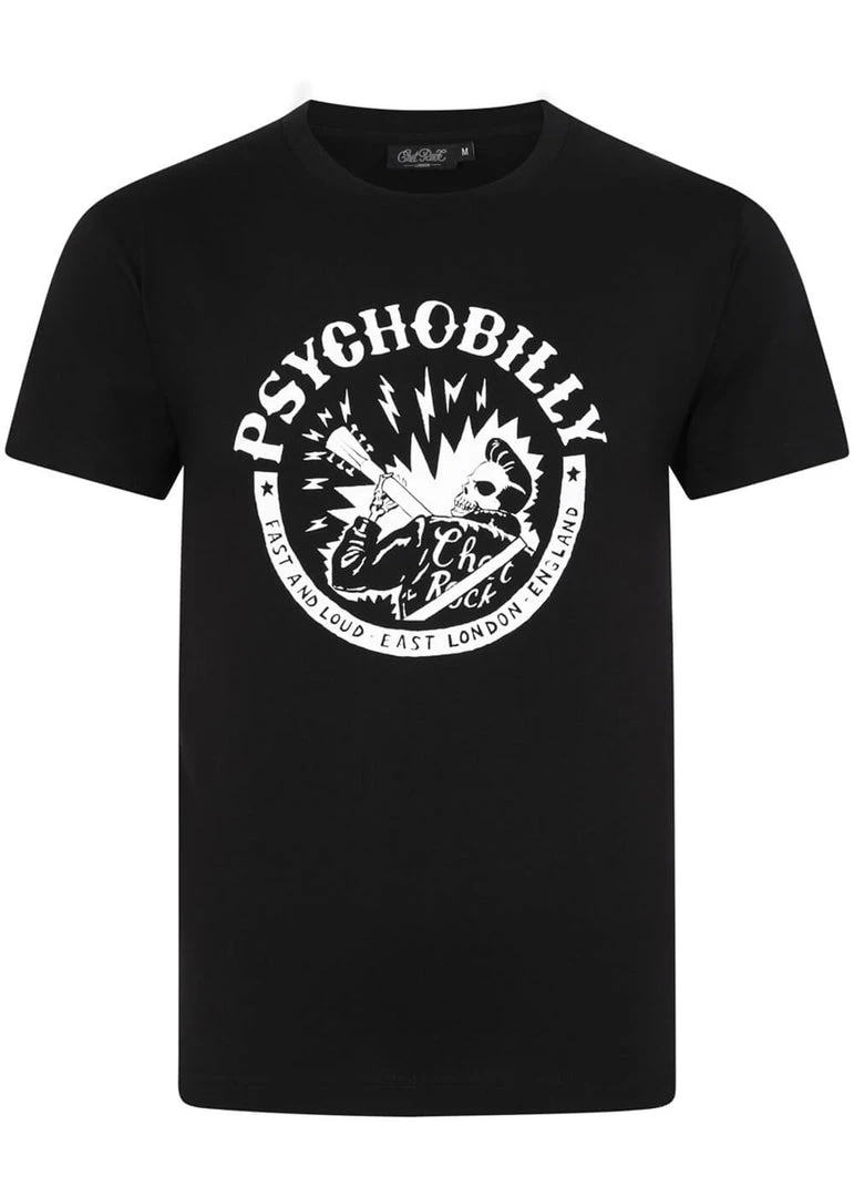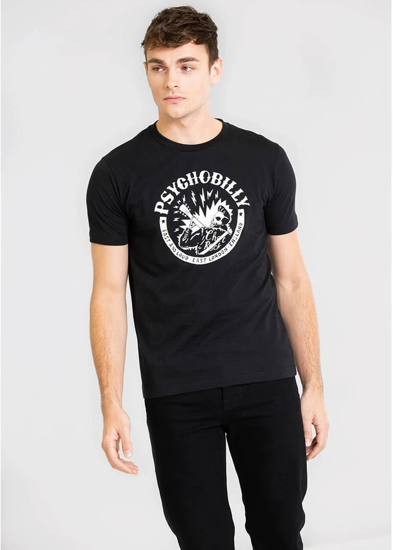 Rockabillys en psychobillys listen up, this ones for you! This convenient t-shirt is made of 100% cotton with a slight stretch. Add some jeans and you’re done! The print reads the text ‘Fast and Loud – East London – England’ and an extraordinarily well-cut skull on a black background.