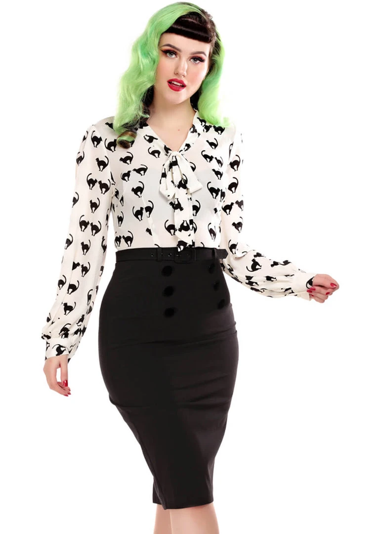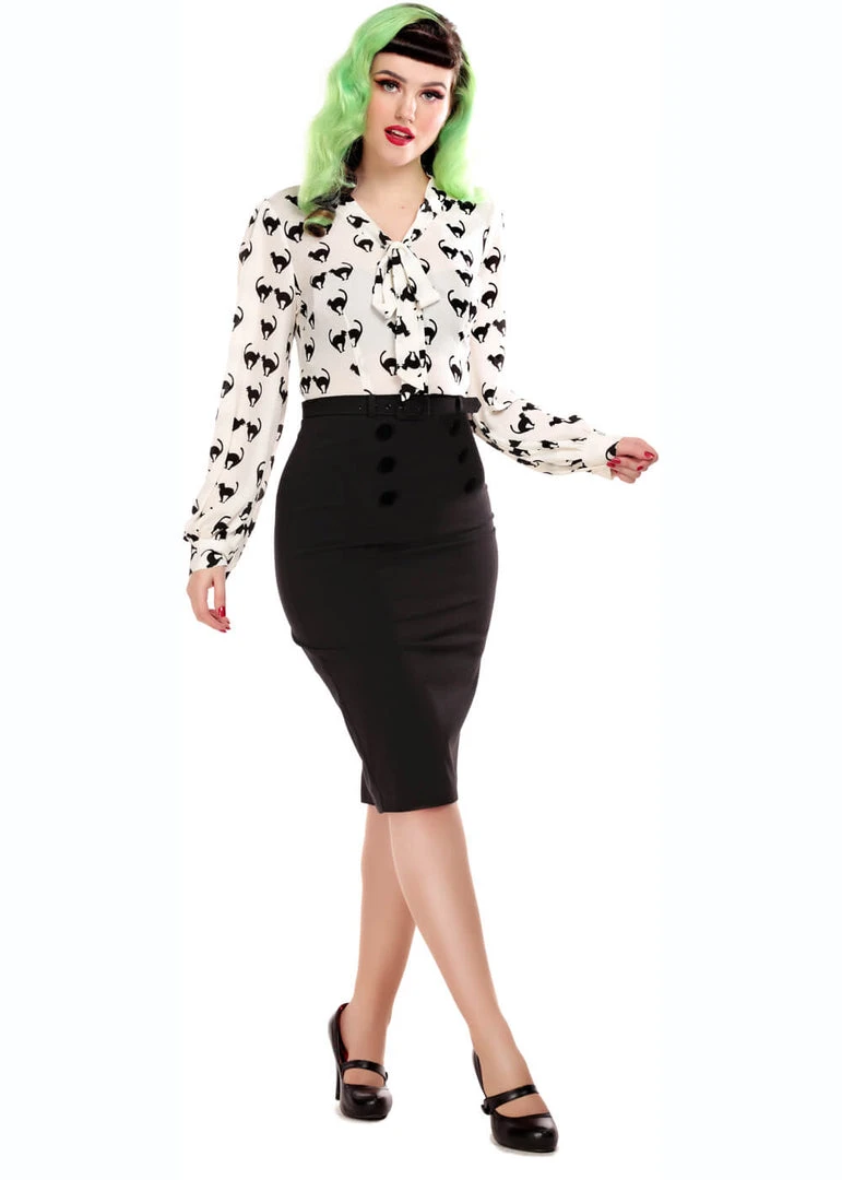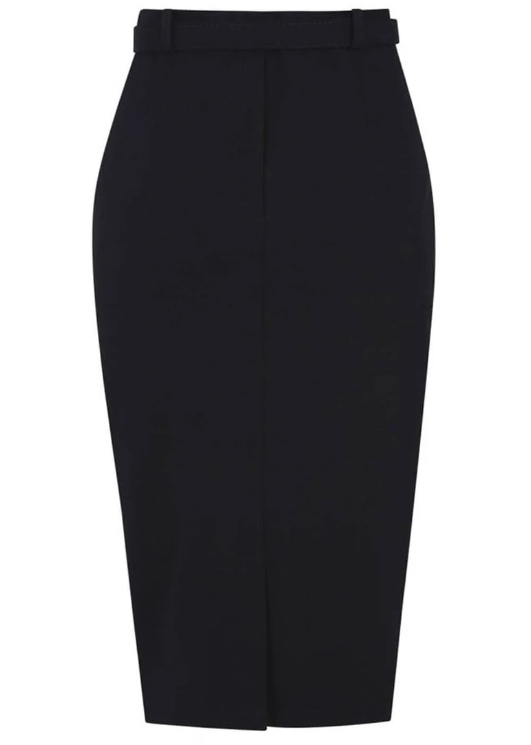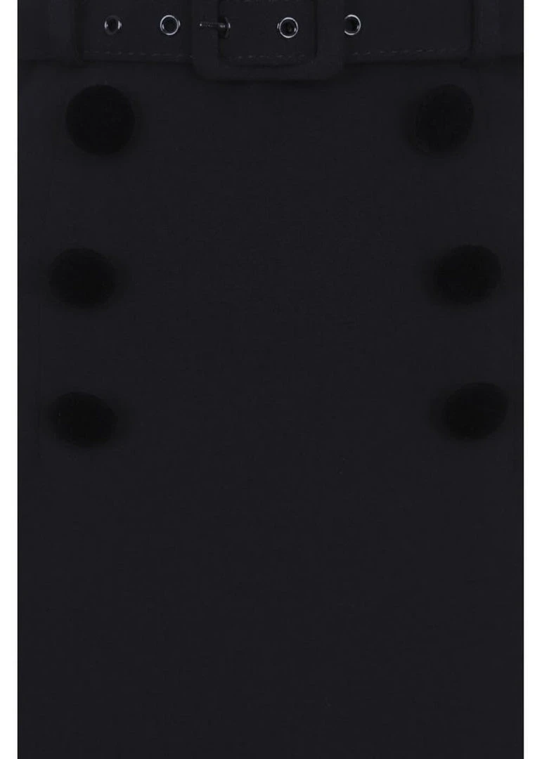 This cutie has just that little extra with those gorgeous velvet covered buttons, which transform even the simplest blouse or pullover into a dream look! The waist is accentuated with a velvet, loose belt, down from which she flares out into a vavavoom pencil skirt. With a height of 1,70 she reaches down to the knee and closes with a zipper on the back where she also has a slit. She is made of a beautiful fabric with a slight stretch and has a wine red lining to serve as the cherry on top.