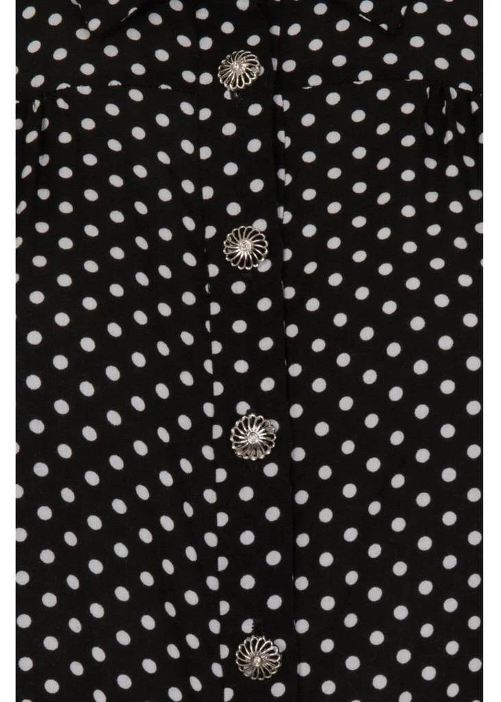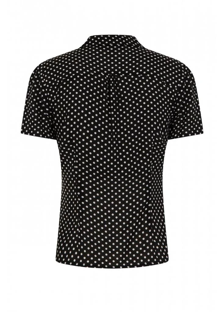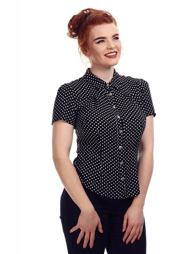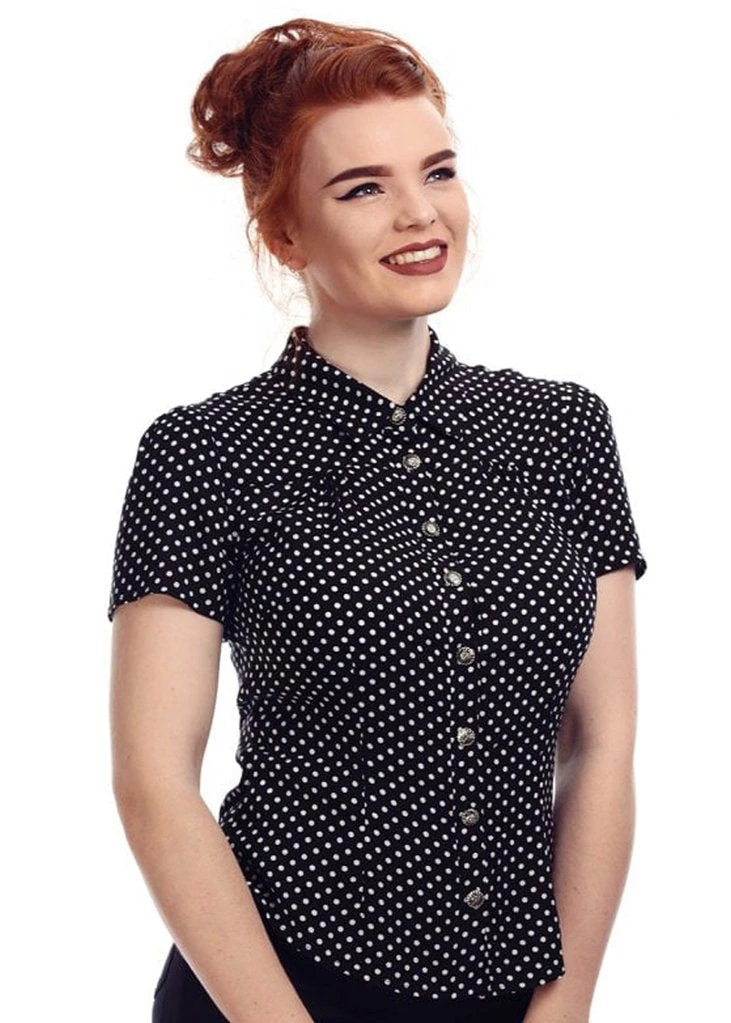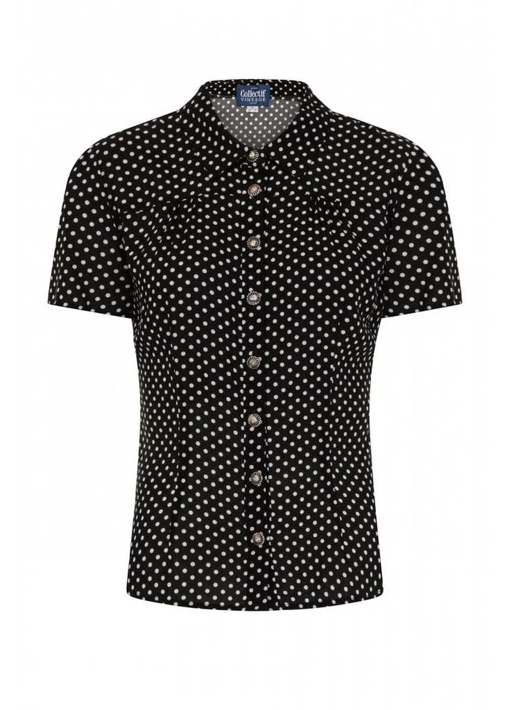 This blouse has everything our vintage heart desires. First and foremost ofcourse those polka dots! But also those extra pleats on the chest and back, creating a gorgeous 40’s fit. She closes with graceful buttons on the front. She is perfect to wear with a high waist skirt to create an elegant look, but she’ll look great with some jeans too.