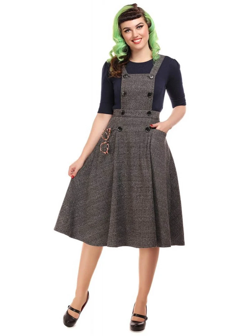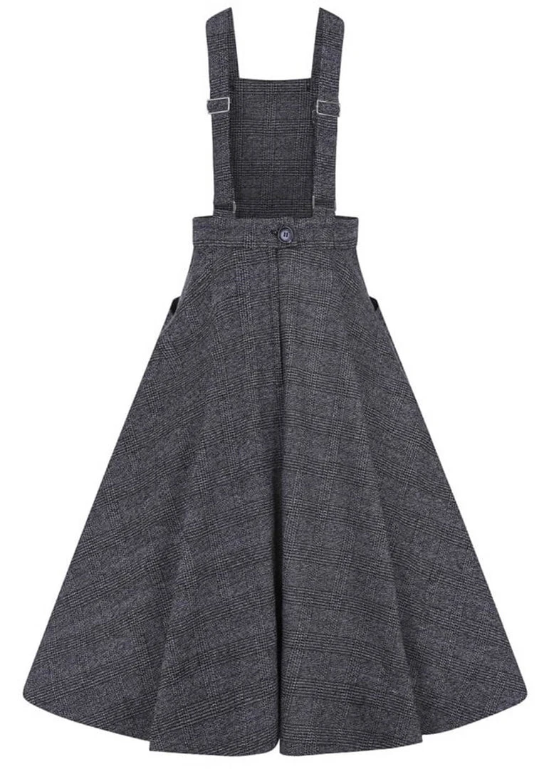 Whether you style her with a nice blouse or a cozy cardigan, with such an elegantly woven check pattern Brenda is a beauty… She has decorative buttons on the front but she closes with a zipper on the back. The braces are adjustable but not detachable.