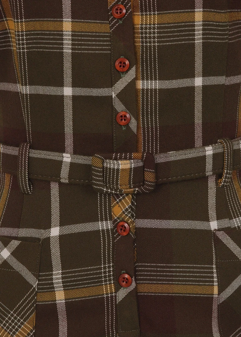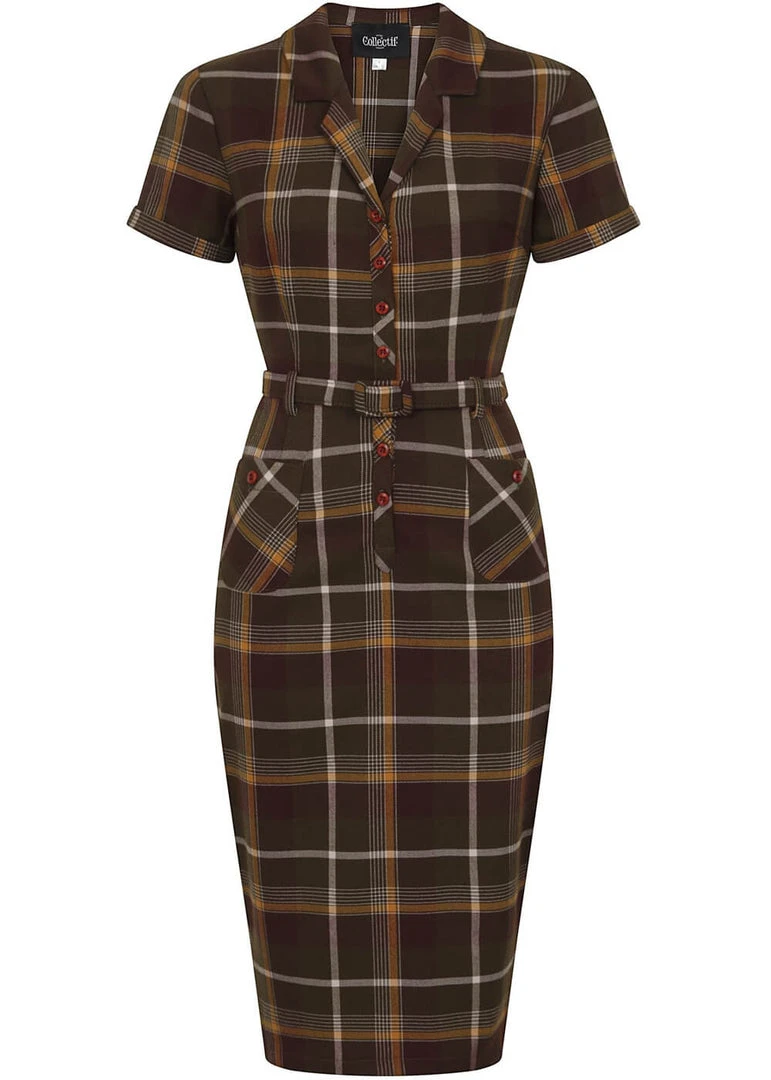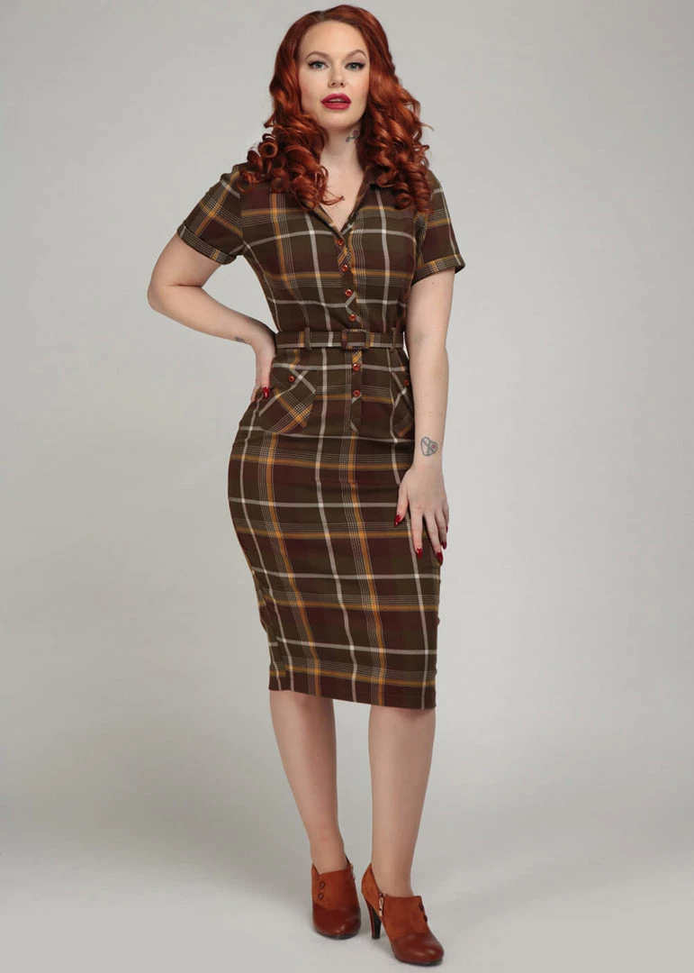She looks so cozy with her brown tartan, perfect for fall! Thanks to her slight stretch she feels like a dream to wear, and is gorgeousy formfitting. The waist is accentuated with the belt, for that Vavavoom 50’s line. She closes with the buttons in front creating a timeless shirt look, down from which she continues down to the knee with a height of 1,70. She even has little pockets!