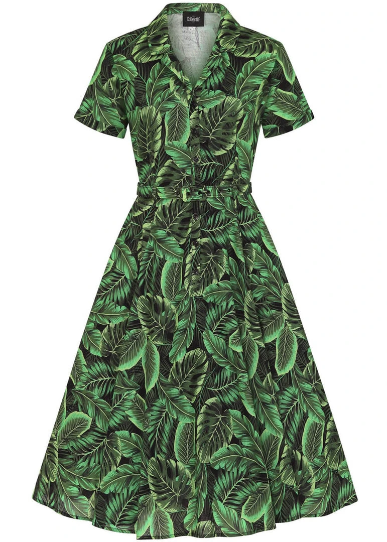 This beauty looks incredibly lightweight with her fine cotton-mix with slight stretch, subtle texture and her exotic leaf pattern… She closes with buttons in the front for a timeless shirt-look. The waist is accentuated by the belt, from where she flares into a full skirt that ends around the knees or just below for a height of 1,70 m.