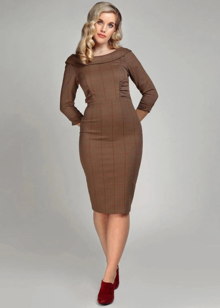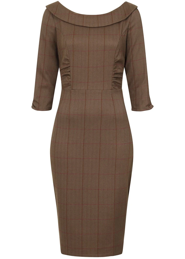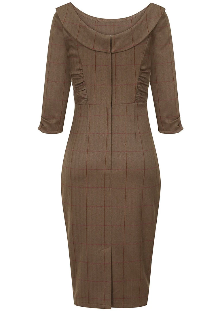 Collectif Cheyenne Herringbone 40’s Pencil Dress Brown