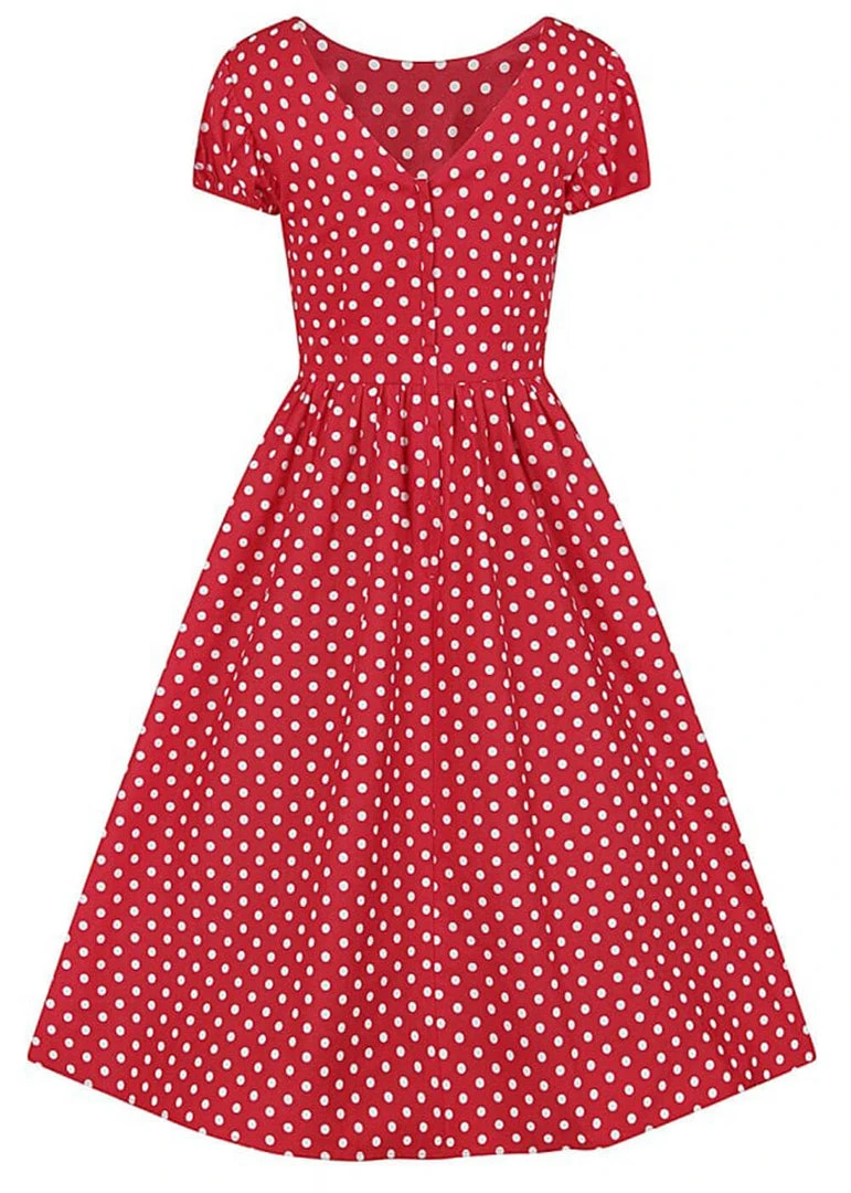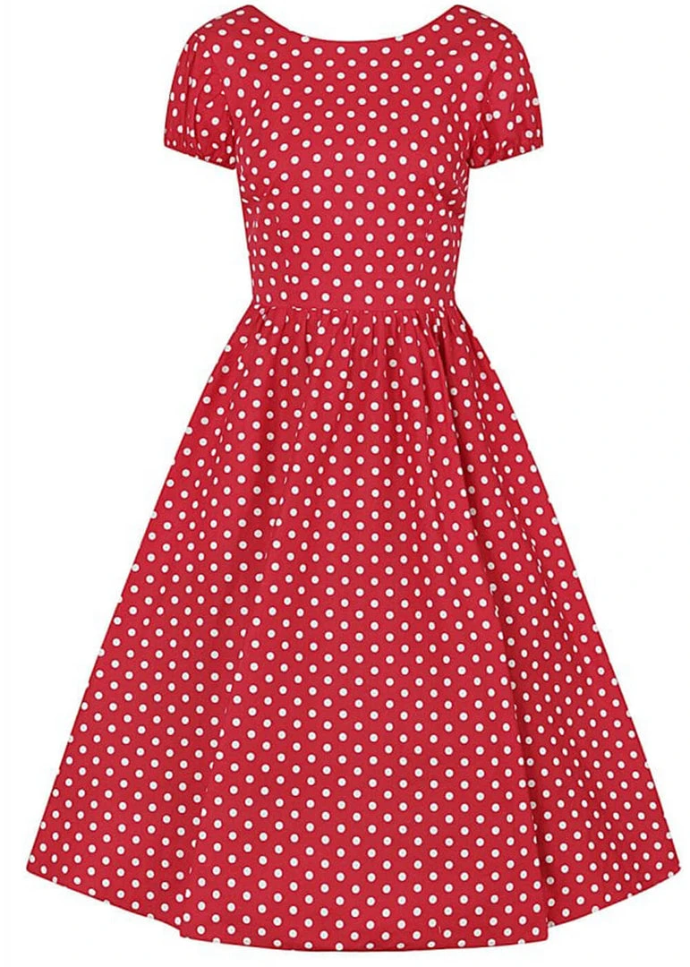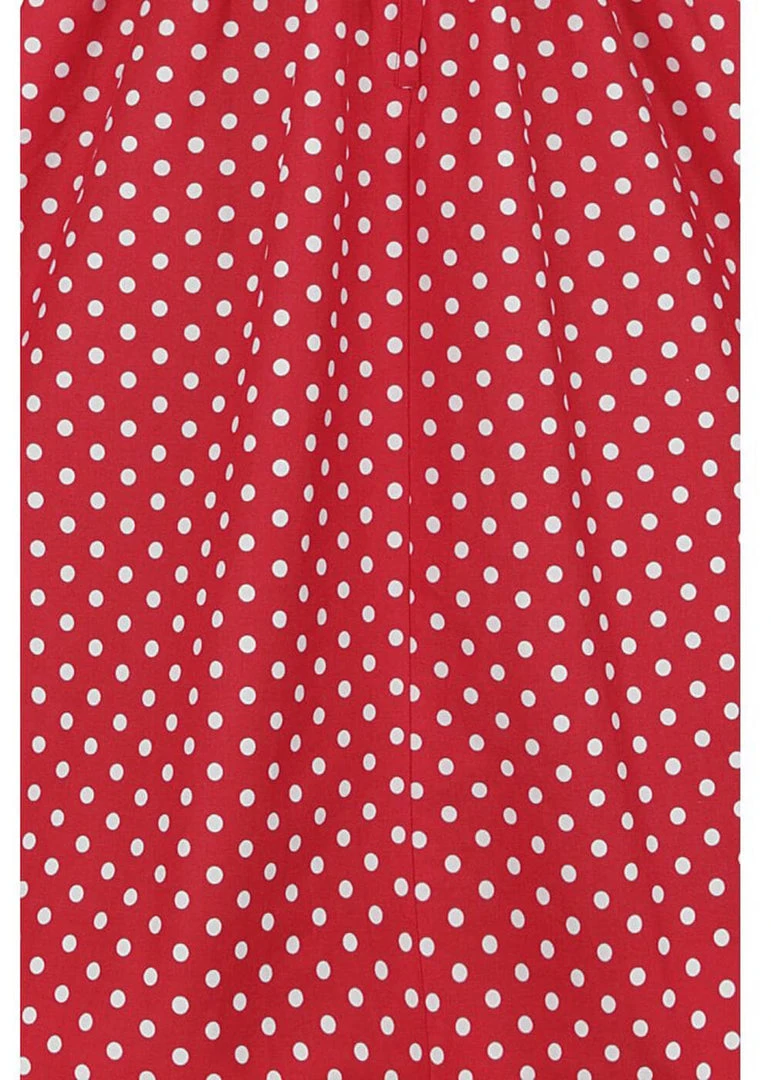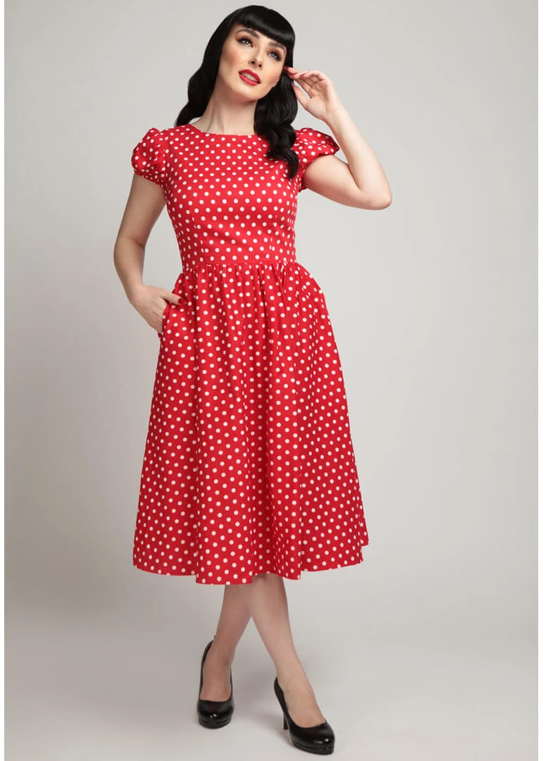 This beauty is buried in dots on a beautiful quality cotton-mix with a slight stretch. Her high neckline, charming V shape on the back and princess seams ensure for a gorgeous fit. And then those sleeves, which cheerfully puff up because of the elastic! The waistline is slightly lower than you’re used to by Collectif (in the natural waist), down from which she flares out through little pleats into a playful skirt which reaches down over the knees. She closes with a zipper on the back.