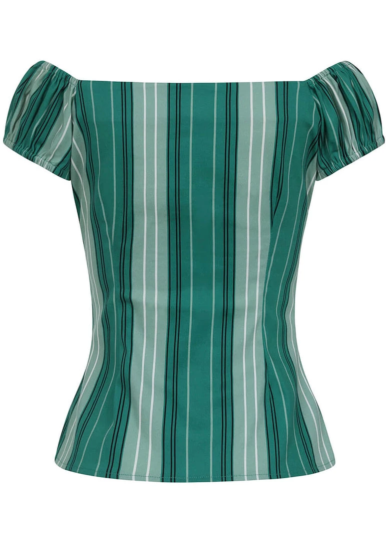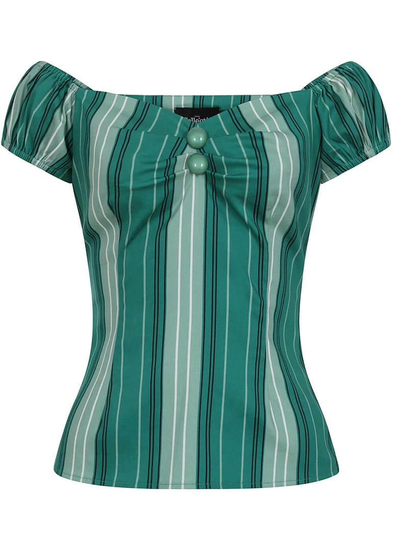 This cutie is THE classic among Collectif tops, with her sexy pinup appearance thanks to the sweetheart neckline and the typical carmen style sleeves, which are slightly puffy because of the elastic.