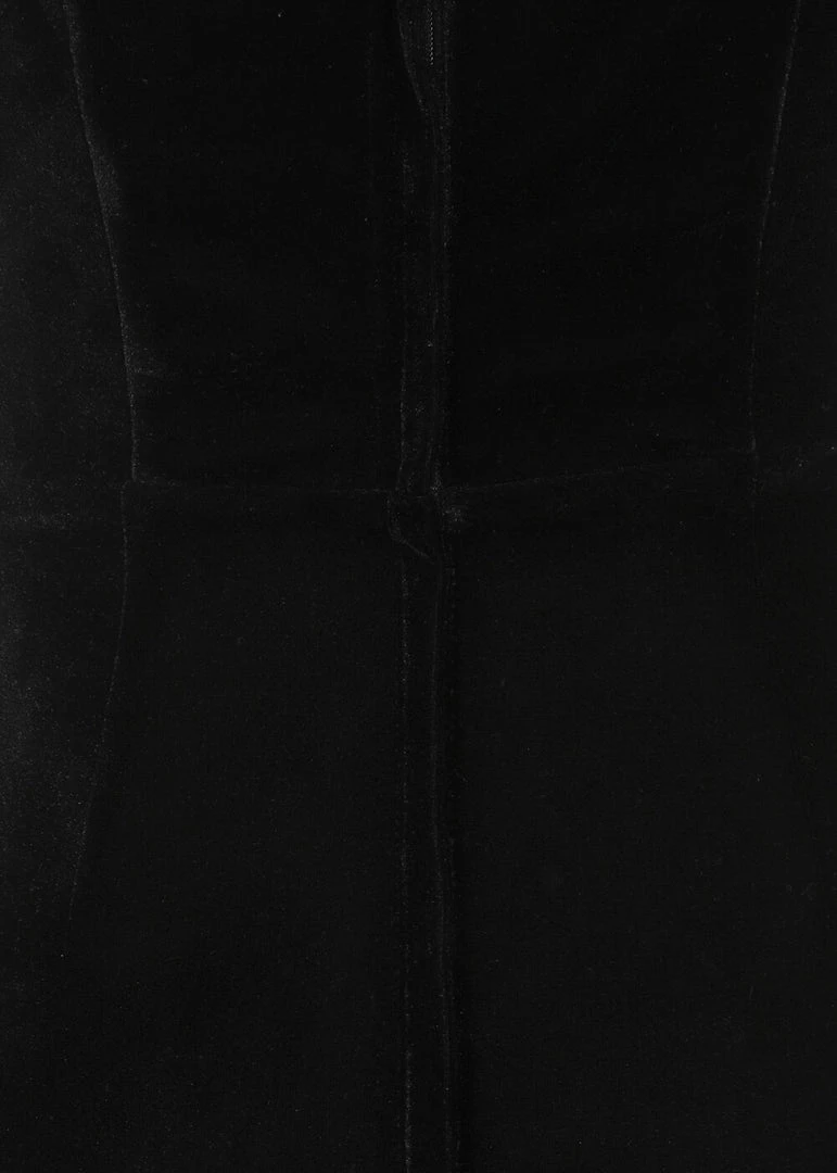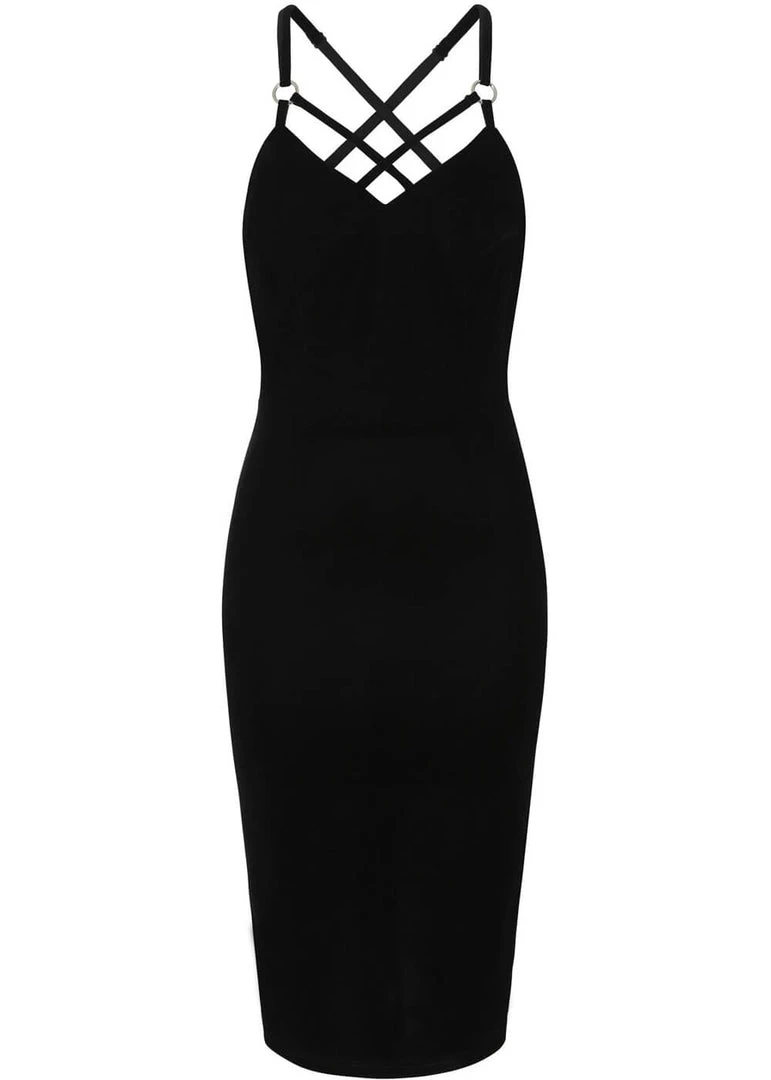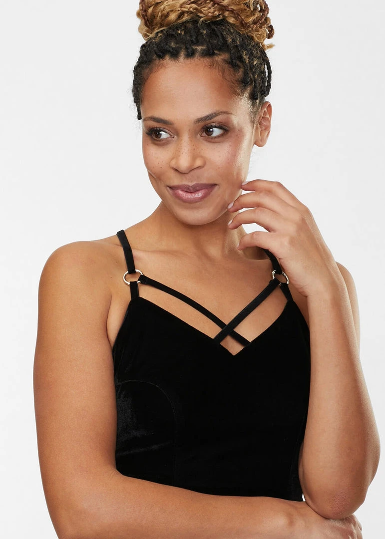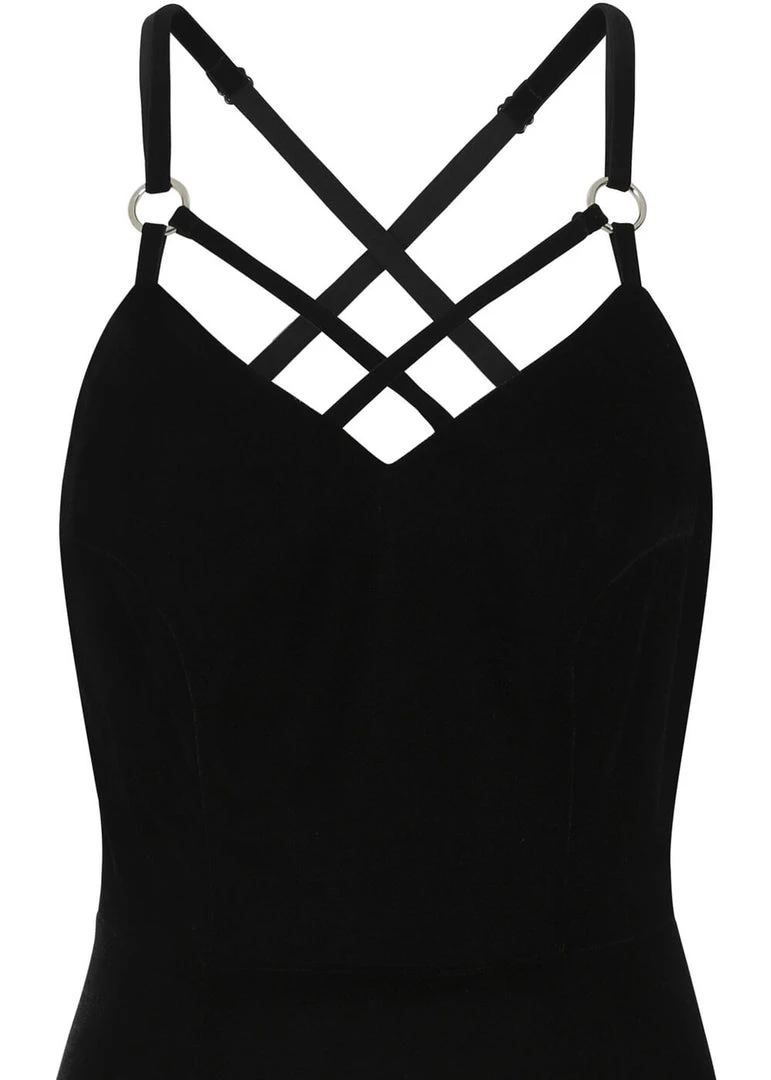 Your perfect Little Black Dress is already stunning from the front with those killer curves her stretchy velvet and figure seams make for. But then you turn around….BAM: the sensual straps, that are adjustable, too! For a height of 1.70m, she ends below the knees and she closes with a zipper in the back, where she also has a split.