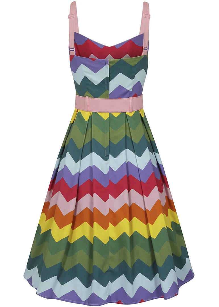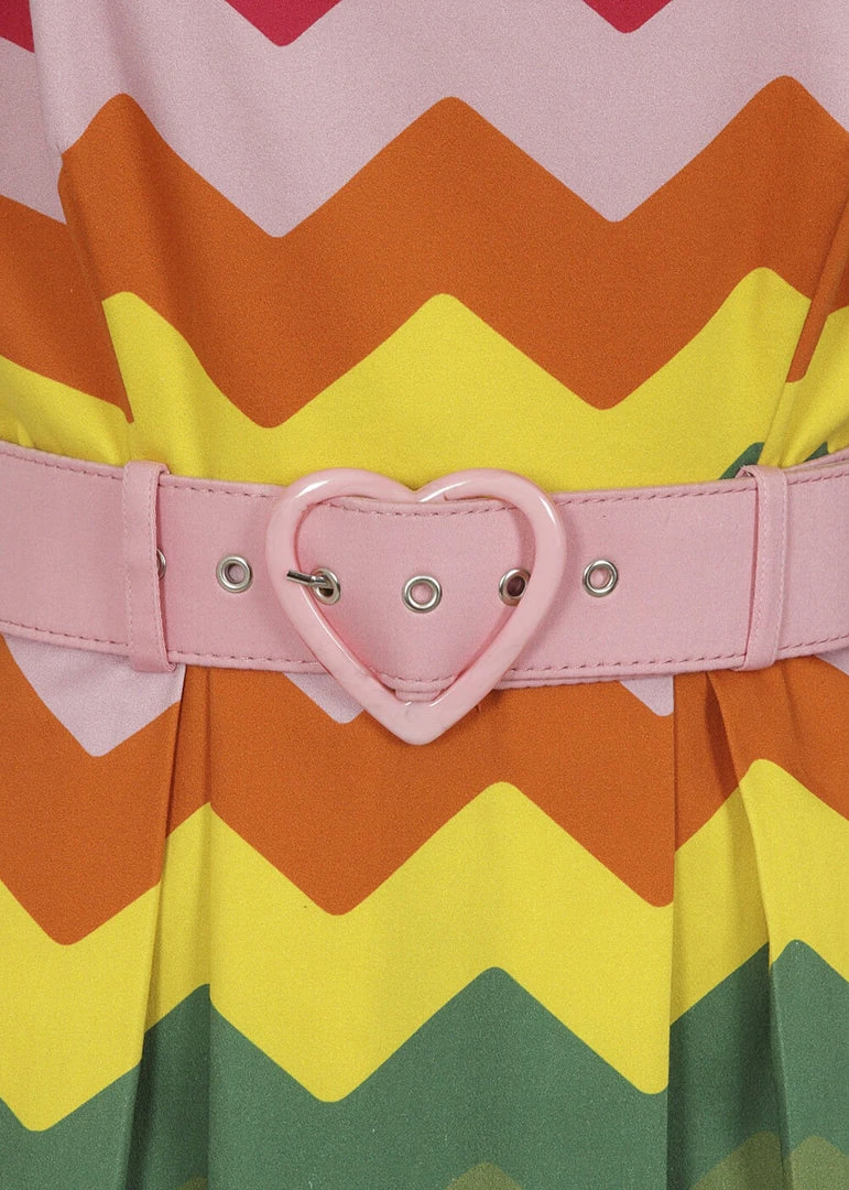 The waist is accentuated by the removable belt with the cute heart-buckle, with pleats falring into an elegant full skirt, that you can wear with one of our petticoats to make that rainbow shine even more. She falls just below the knees for a height of 1,70m and she closes with a zipper in the back.