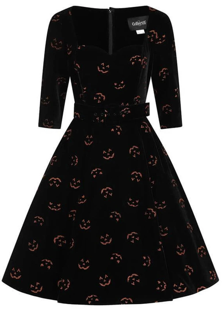 No Spooky-Girl can resist this gem with pitchblack velvet, covered in glitter-pumpkins…The waist is accentuated by the removable belt, from where she flares into a full skirt. Perfect to combine her with one of our petticoats for the extra spooky touch! For a height of 1.70 m, she falls below the knees, and she closes with a zipper in the back.