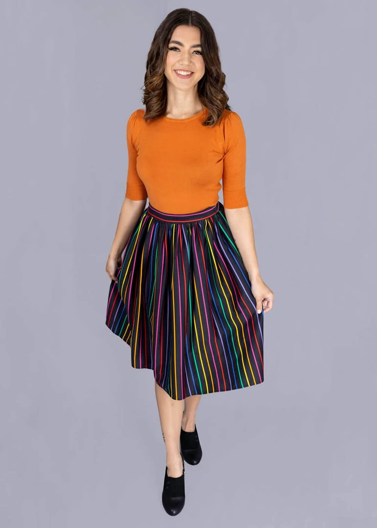 Jasmine is a classic 50’s high waist cut, which runs through narrow pleats down from the waist band into a full skirt with pockets, that you can beautifully wear with one of our petticoats to make the stripes come out even better.