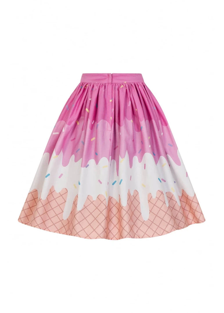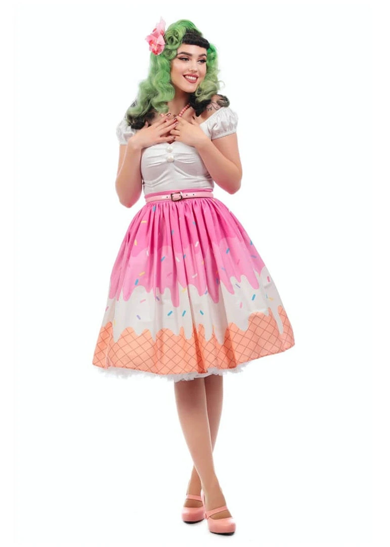 Fortunately, she doesn’t melt, because this beauty is made of a stunning quality cotton with fine stretch 😉 Jasmine is a classic 50’s waist model, which flares from narrow pleats into a full skirt with pockets from the waistband downwards. To make that print shine even more you can wear her with one of our petticoats. She closes with a zipper and a hook on the back and with a height of 1,70 she reaches down to the knees.
