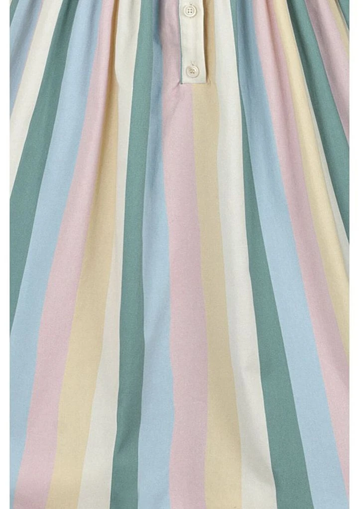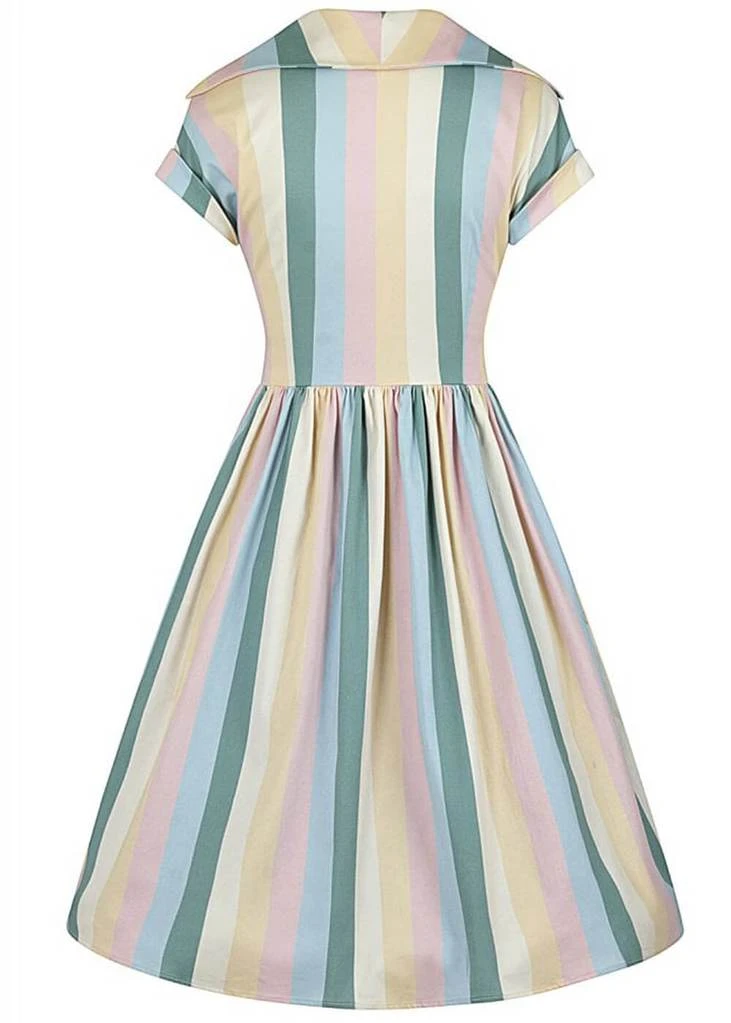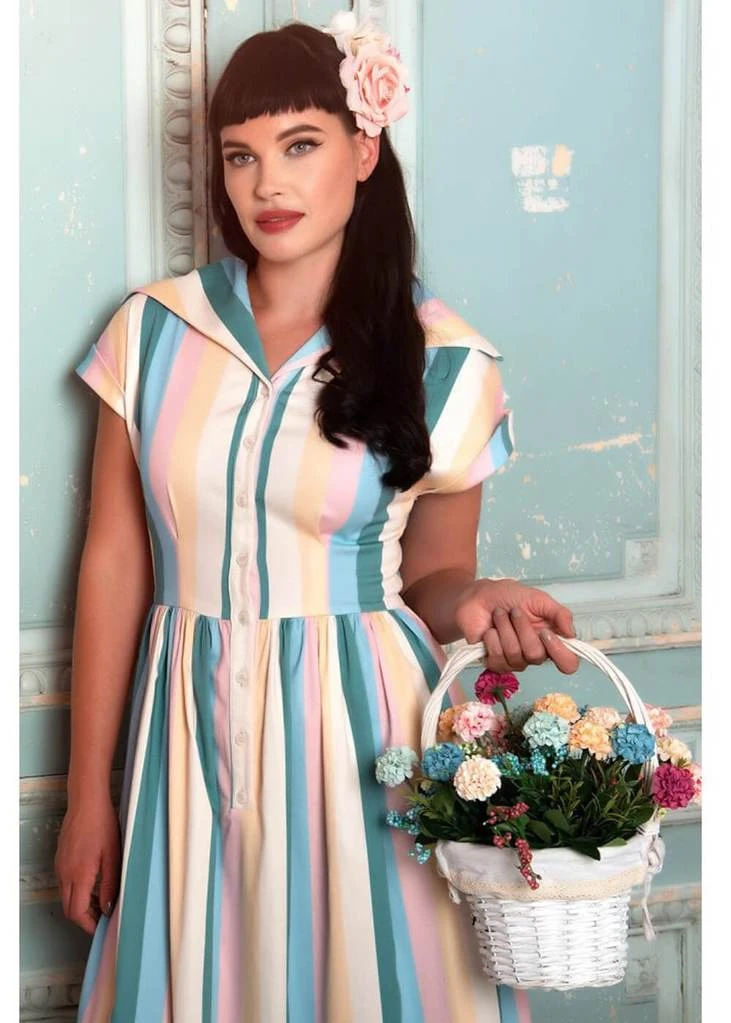 Judy might as well have just walked straight from the 50s with her collar, functional buttons on the front and folded sleeves! From the waist down she flares out through pleats into a playful skirt with pockets, which you can gorgeously combine with one of our our petticoats to make those stripes shine. With a height of 1,70 she reaches down just over the knee and she closes with the buttons on the front.