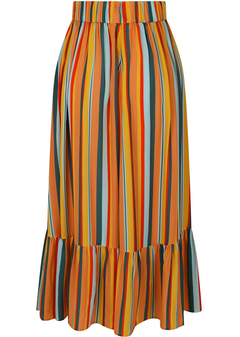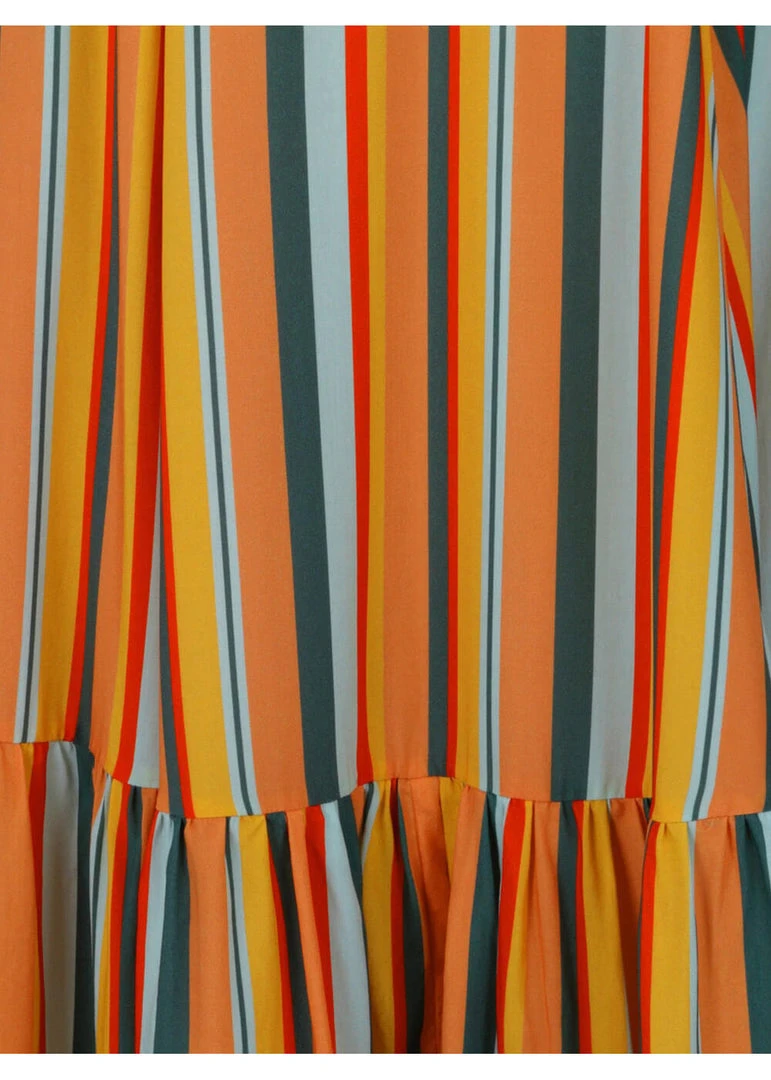 With stripes in colours this cheerful all you’re missing is a nice drink! This cutie is made of a lovely airy, lightweight 100% viscose with no stretch, making her your best friend during summer. From the waist down she flares out into a flowy skirt, which with a height of 1,70 reaches down to just above the ankles. She closes with a zipper on the back.