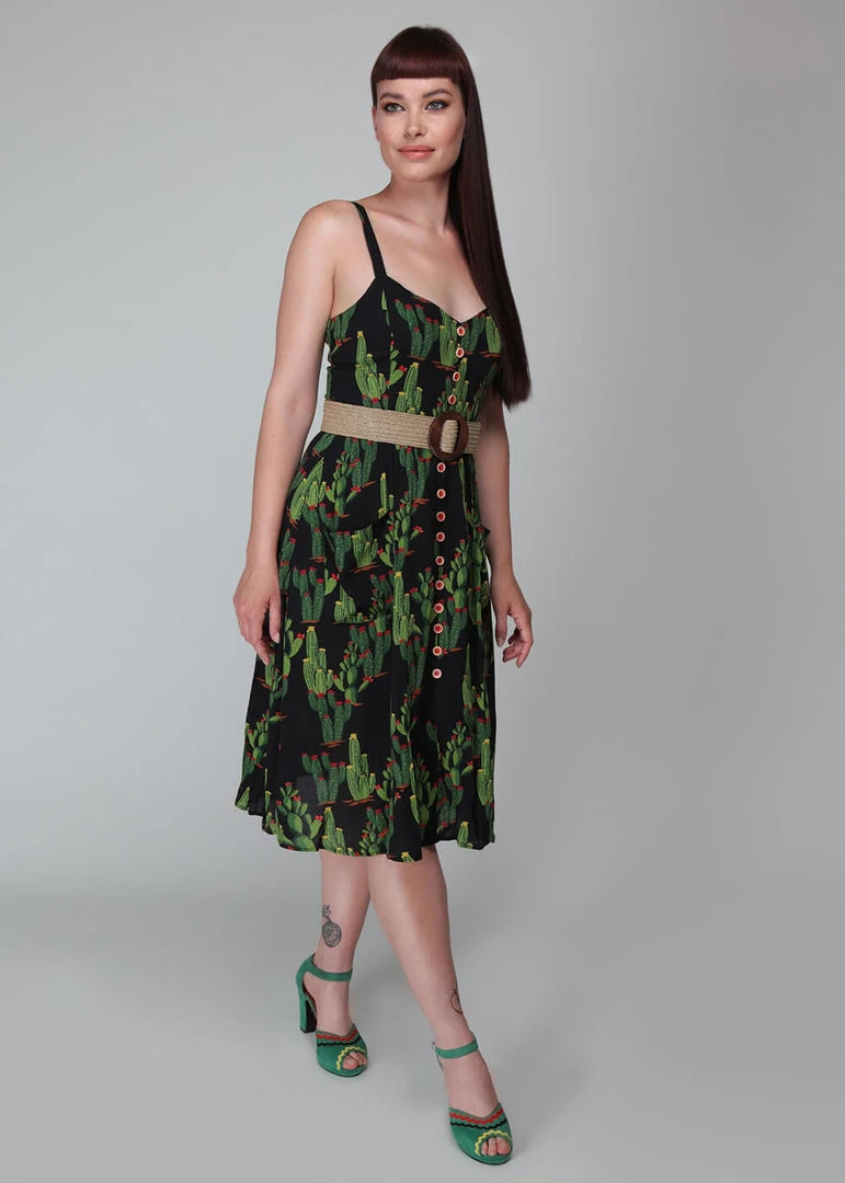 She’s made of a soft 100% viscose with no stretch which feels lovely and airy to wear, with this we’ll dare into those tropical temperatures! The elastic back adds a beautiful fit and the shoulder straps aren’t just adjustable, but also detachable on the back so you can choose to wear them criss-cross. Her red filled buttons make for a perfect summery tiki look, especially with some bamboo accessories thrown into the mix.