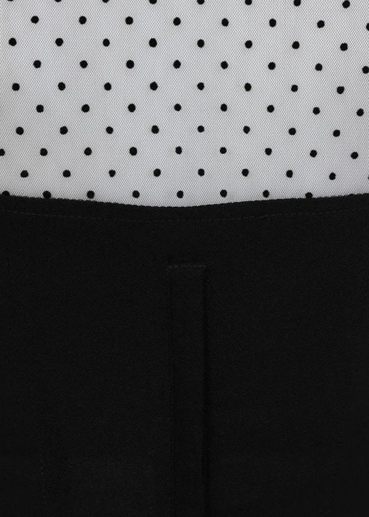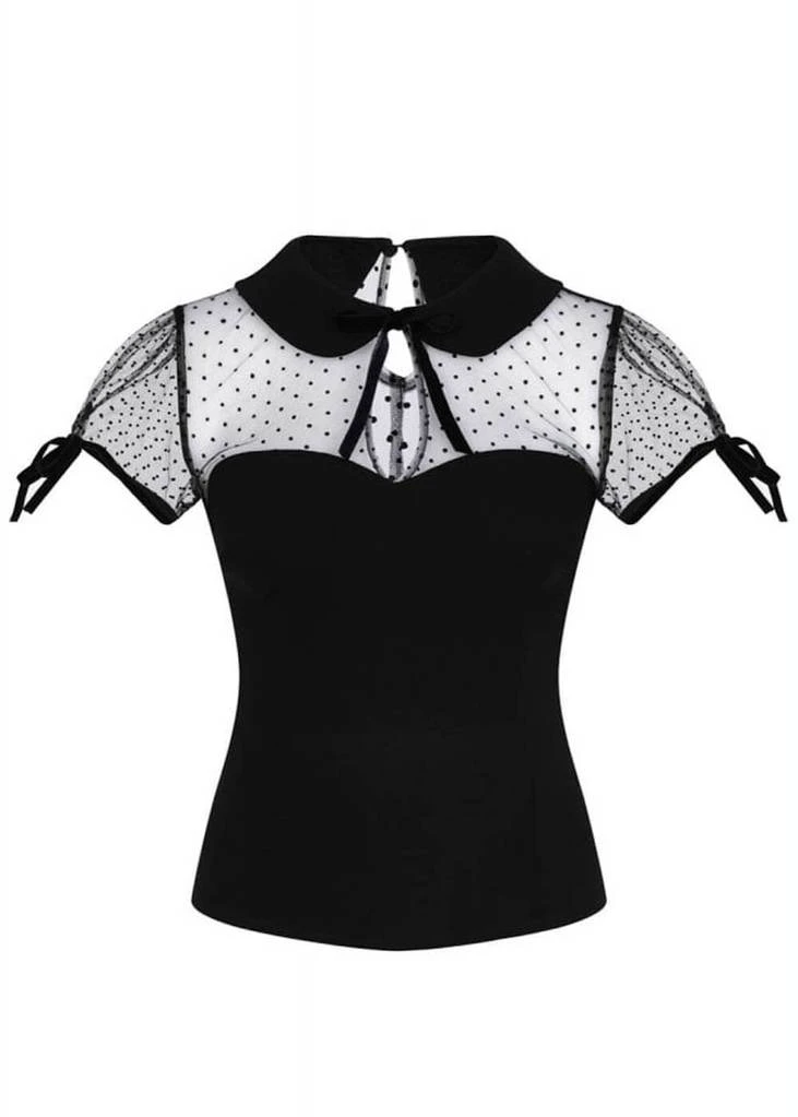 This beauty is both sexy and innocent at the same time, with her sweetheart neckline and Peter Pan collar, and inbetween that boudoir worthy mesh with velvet polkadots! The puffy sleeves and the peekaboo down the neckline are both decorated with a velvet ribbon aswel. The keyhole on the back can be created by closing the button.