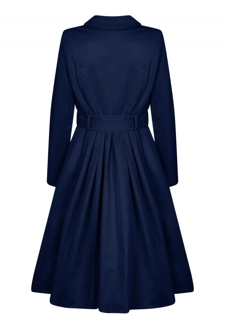 The collar and double row of buttons give a strong look, while the pocket make her practical (and indispensable!). The upper part has princess seams for a perfect fit and the waist accentuated with the loos sash. After that she flows out into a full swing coat, as the back is pleated! The full effect while the front looks calm and simple.