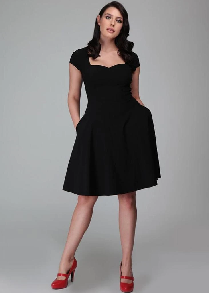 This cutie has it all. Because of her stretchy bengaline she not only feels like a dream to wear, she is so beautifully formfitting that all your curves will shine! Also because of the sweetheart neckline and cap sleeves ofcourse! From the waist down she flares out into a playful skirt which with a height of 1,70 reaches above the knee. She closes with a zipper on the back.