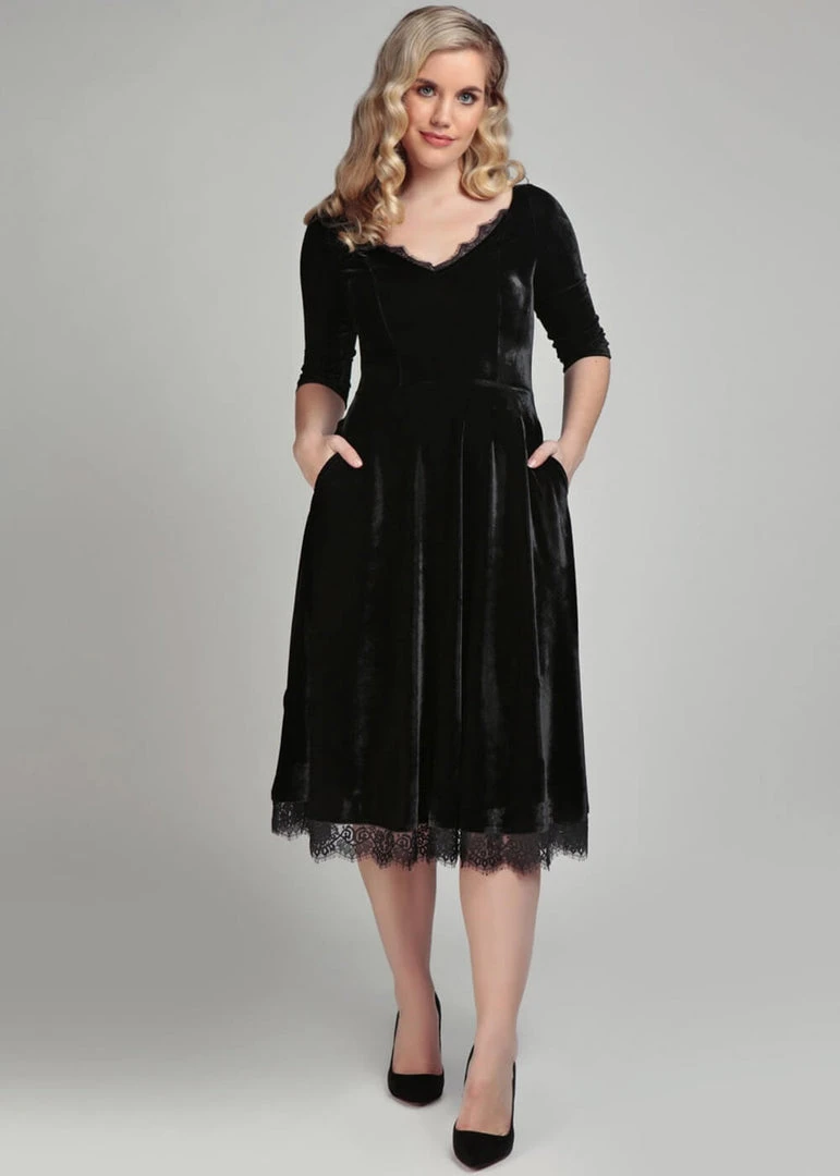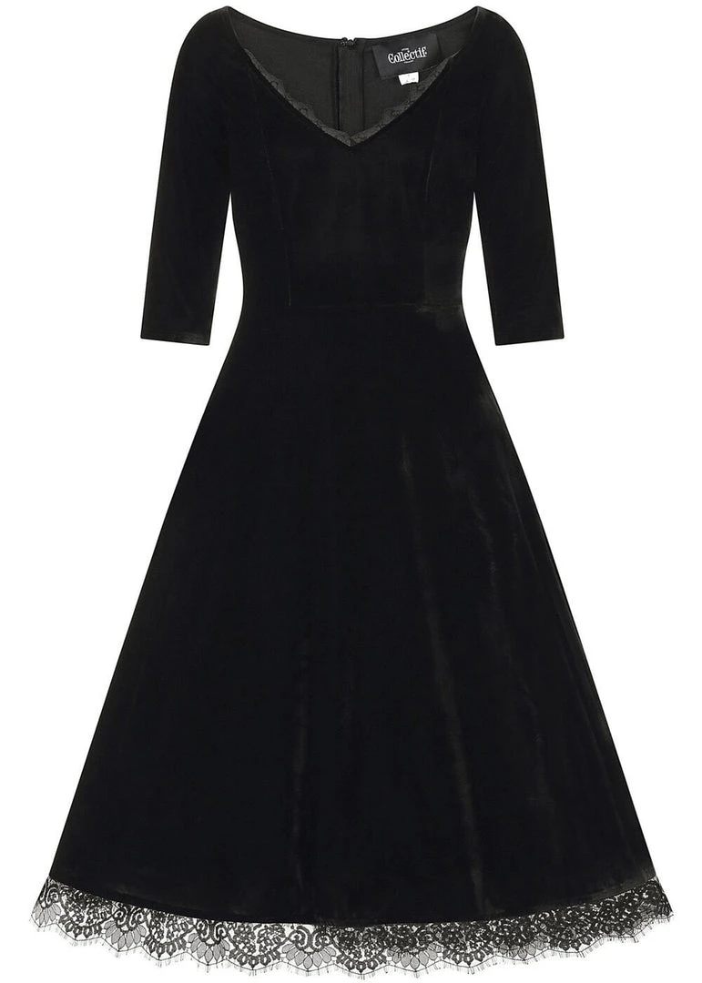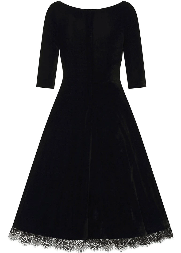 Made of a gorgeous quality stretch velvet, a FAB look is inevitable! The wide and seductive v-neck is lined with delicate lace, that also returns on the lower seam. From the waist, she flares into a full skirt that you can beautifully wear with one of our petticoats for an even more festive look. For a heigth of 1.70 m, she ends below the knees and she closes with a zipper in the back.