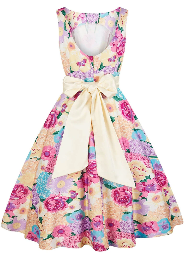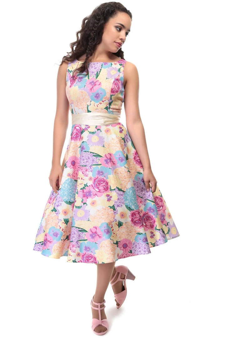 In de Margaret jurk kon jij in de jaren ’50 zeker in een chique gelegenheid verschijnen! Ze heeft niet alleen een adembenemend zachte bloemenprint op katoen, maar ook een modelletje om van te kwijlen met haar hoge hals en lage ronde ruglijn.