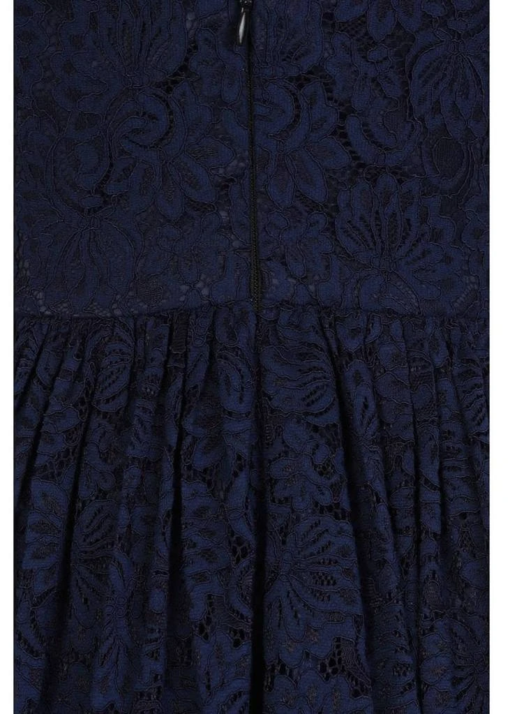 This dress consists of a nacy satin dress with transparant straps but… the showstopper is on top: the transparant layer or mesh with breathtaking flowers! This layer adorably continues down the short sleeves, making them look like they’re on your skin. On the chest this layer has a wrap. She closes with a zipper on the back and with a height of 1,70 she reaches below the knee.