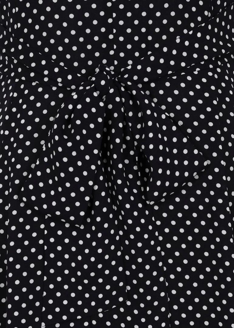 Let the lightweight viscose without stretch hug you… Literally, because the waist is accentuated by tying the sash in the back. The short sleeves are playfully puffy thanks to the gatherings at the shoulders.