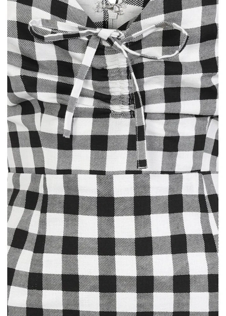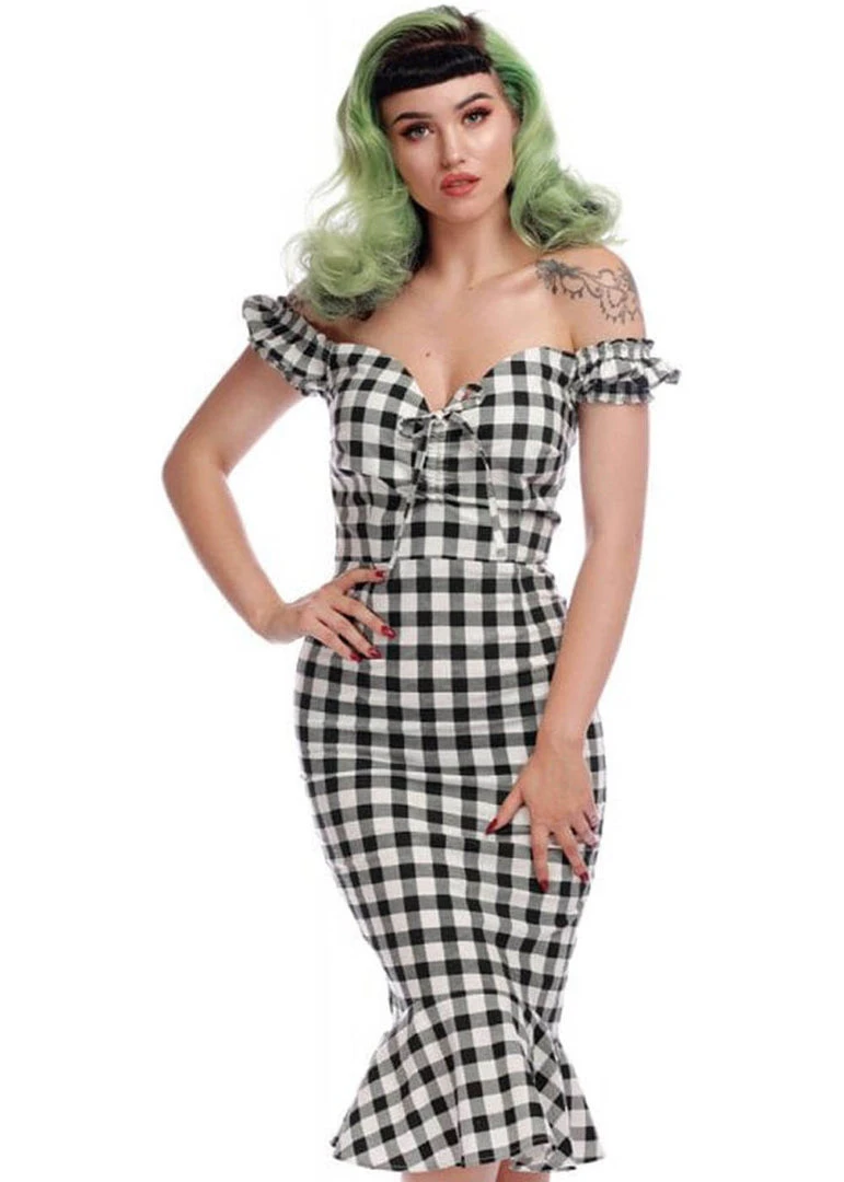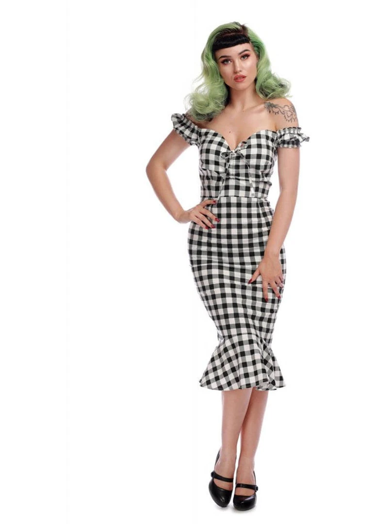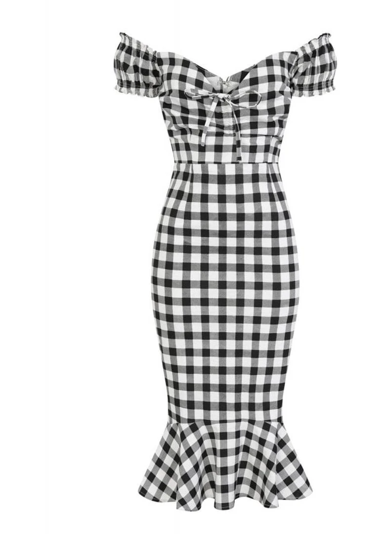 From the puffy cap sleeves which you can wear off the shoulder thanks to the elastic, to the sweetheart neckline with a bow in the middle, with which you can decide how much you want to display 😉 Ofcourse thanks to her soft cotton mix with a slight stretch she has a VaVaVoom fit which makes your killer curves look their best and as a cherry on top she has that thunderous fish-tail! She closes with a zipper on the back and with a height of 1,70 she reaches below the knee.