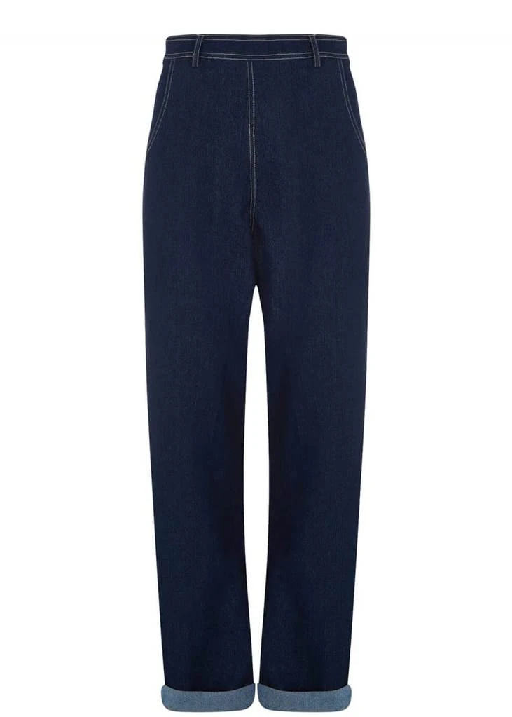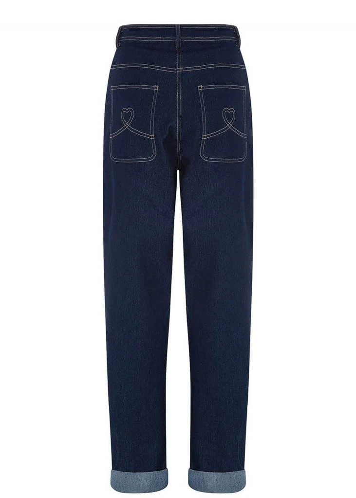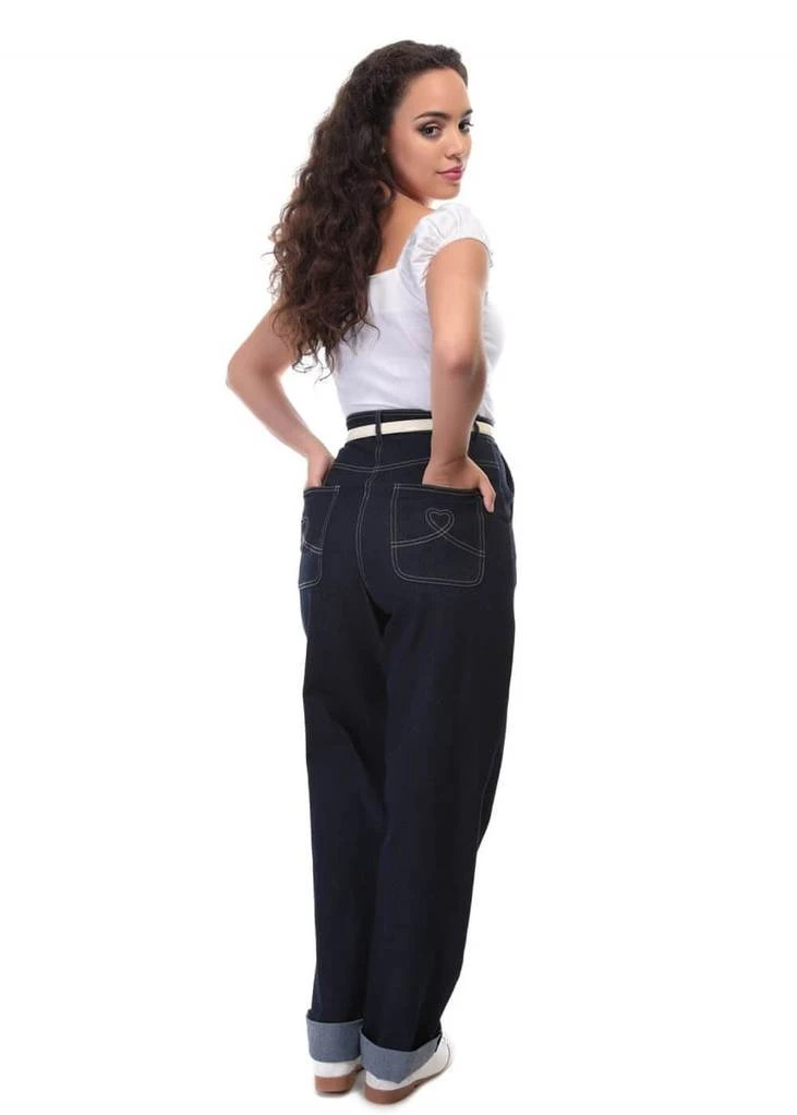 These jeans are worn in the waist and effortlessly provide you with a cool rockabilly look, and we love that no matter what season! These jeans close with a zipper on the side with a button. So no zipper on the front, only seams. She has pockets and two large pockets on the back. With her belt loops you can easily style her up with a coloured belt. Great for every figure! The trouser legs are long and cute when folded up. Amazing!