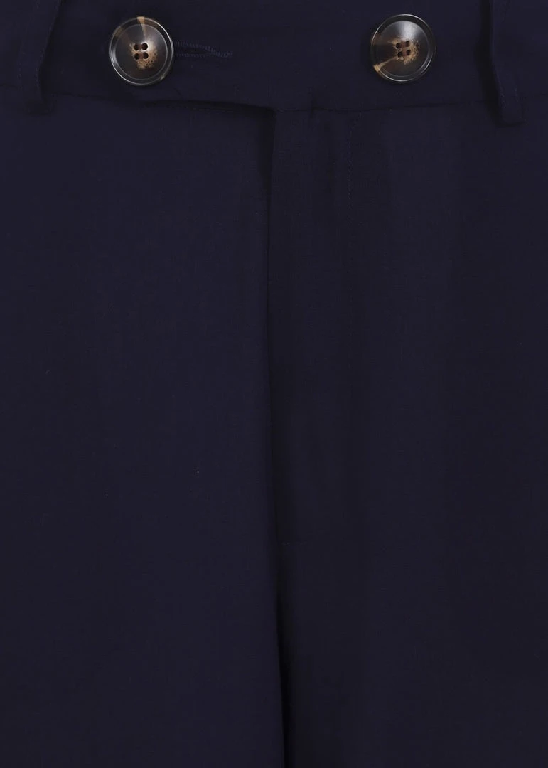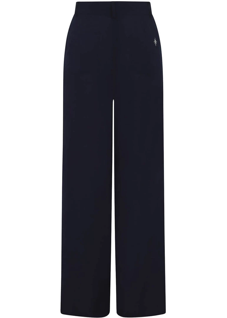 Style from the front, style from the back: Stella has it all! The waistband is adorned with two faux-tortoiseshell buttons, from where she flares into wide legs… Her navycoloured viscose without stretch is so lightweight, it’ll move along with your steps. Besides front pockets, she also has pockets in the back, the left of which is decorated with a star-embroidery! She closes with a zipper in the back and the two stunning faux-tortoiseshell buttons.