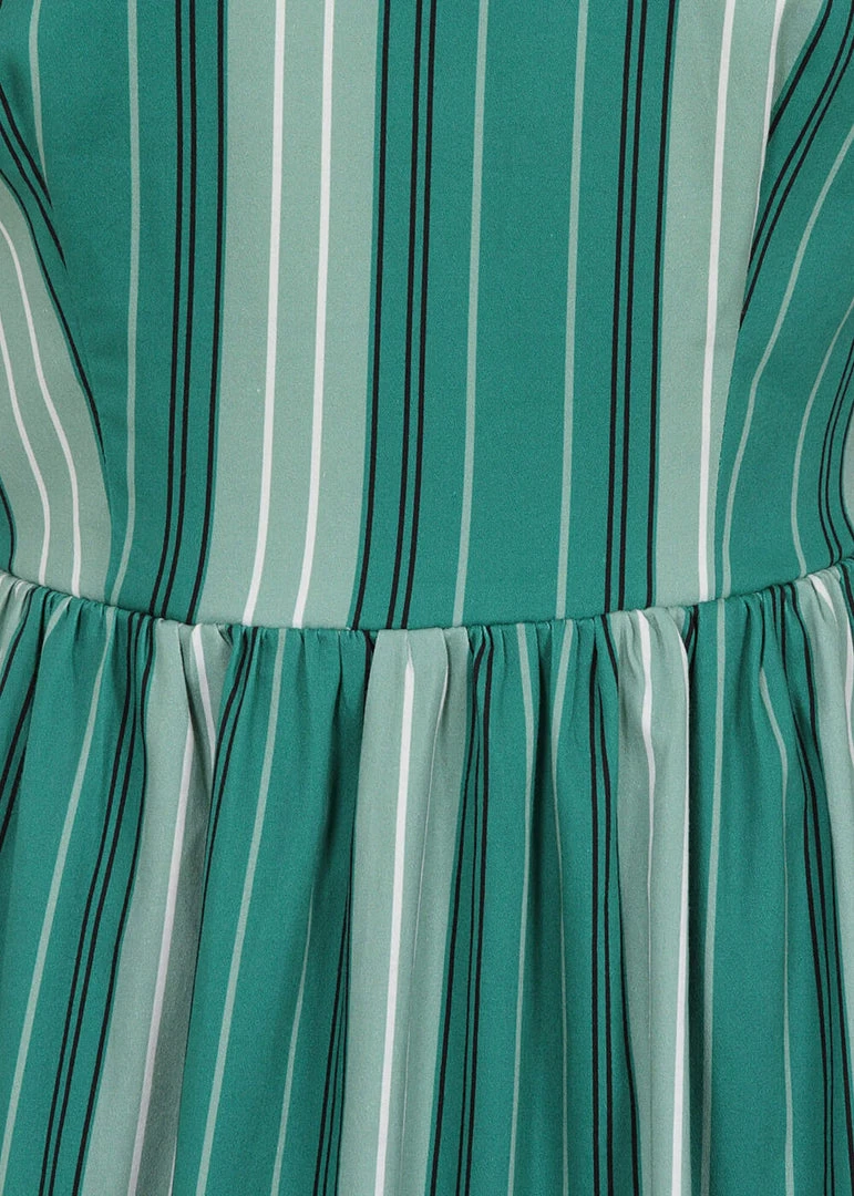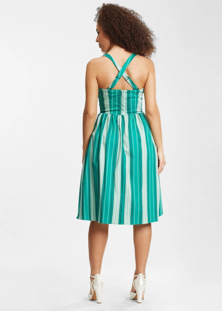 From the waistband, she flares from small pleats into a full skirt with pockets, that you can perfectly wear with one of our petticoats to make those stripes shine even brighter. She closes with a zipper in the back and falls below the knees for a height of 1,70m.