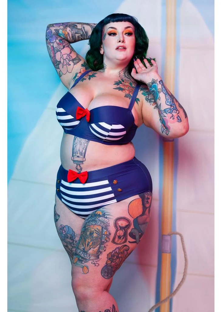 Ship ahoy, the top of the ultimate sailor bikini! This beauty has adjustable straps, padded cups, finished with a wire and reinforcements on either side for the perfect pin up look. She closes with a bikini clip on the backside. Size wise this bikini top fits true to size, if you’re in between 2 sizes you’re better off choosing the larger size, the stretch is counted into the sizing chart.