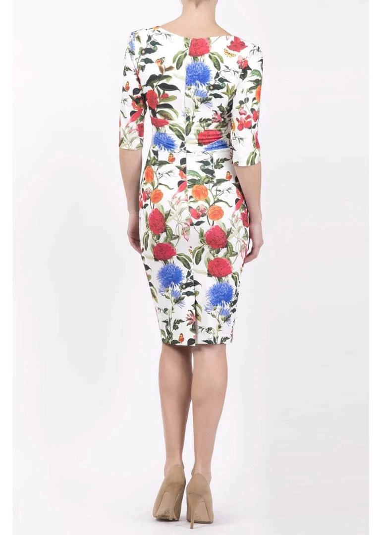 The pleats over the front are masking a little belly and make for a flattering fit, as do the figure seams. She closes with a zipper in the back, where she also has a split to make walking more convenient. Diva Catwalk is made in the UK.