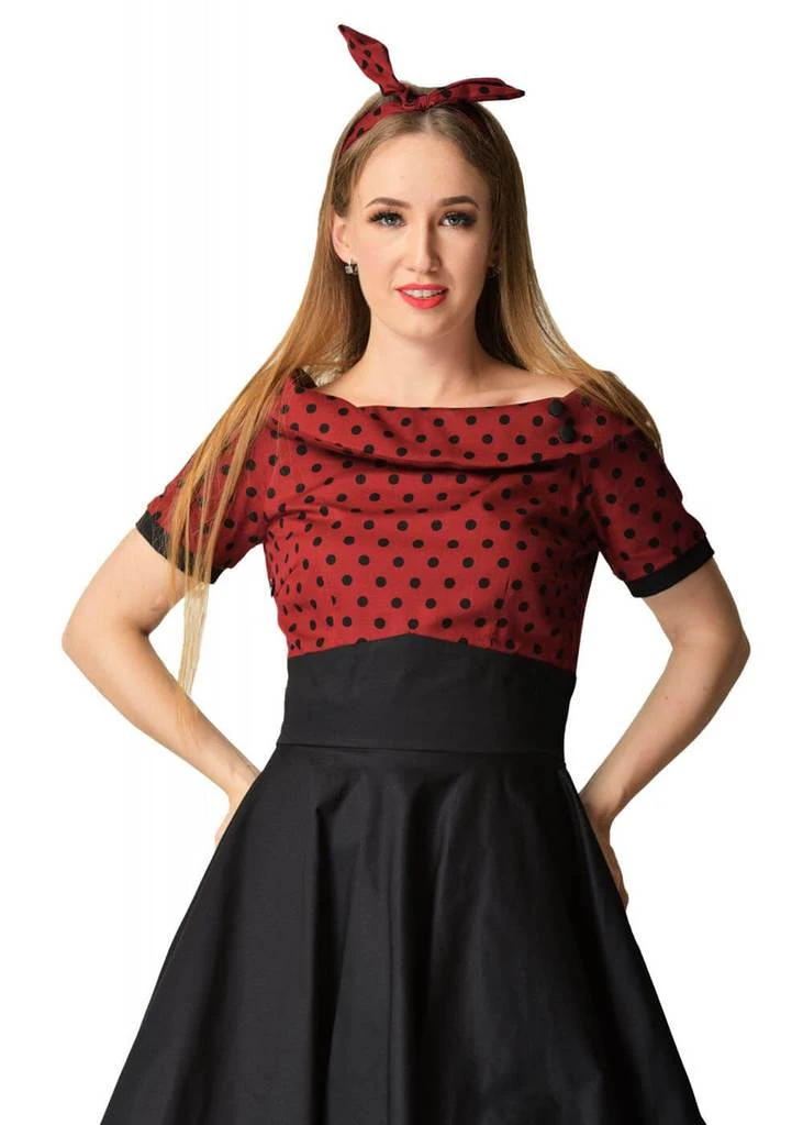 This stunning edition is so striking with those cheerful polkadots on a burgundy background! Her double collar is finished with sweet padded buttons, a colour which can be seen again on the sleeves. The figure seams inside the bodice ensure a beautiful fit.