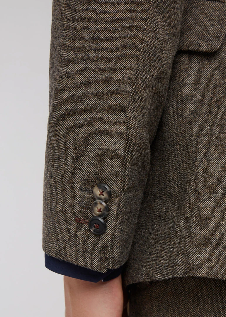 Roger has exactly that look we were looking for, with his classy brown colour. His 65% wool give him a real gentleman look while he’s nice and lightweight at the same time. He closes with 2 buttons in the front and has a regular fit. Apart from 3 (yet to be carefully openend) pockets, he also has 3 inside pockets. The lining is a sensations with its unique design. A pin with the logo completes the picture.