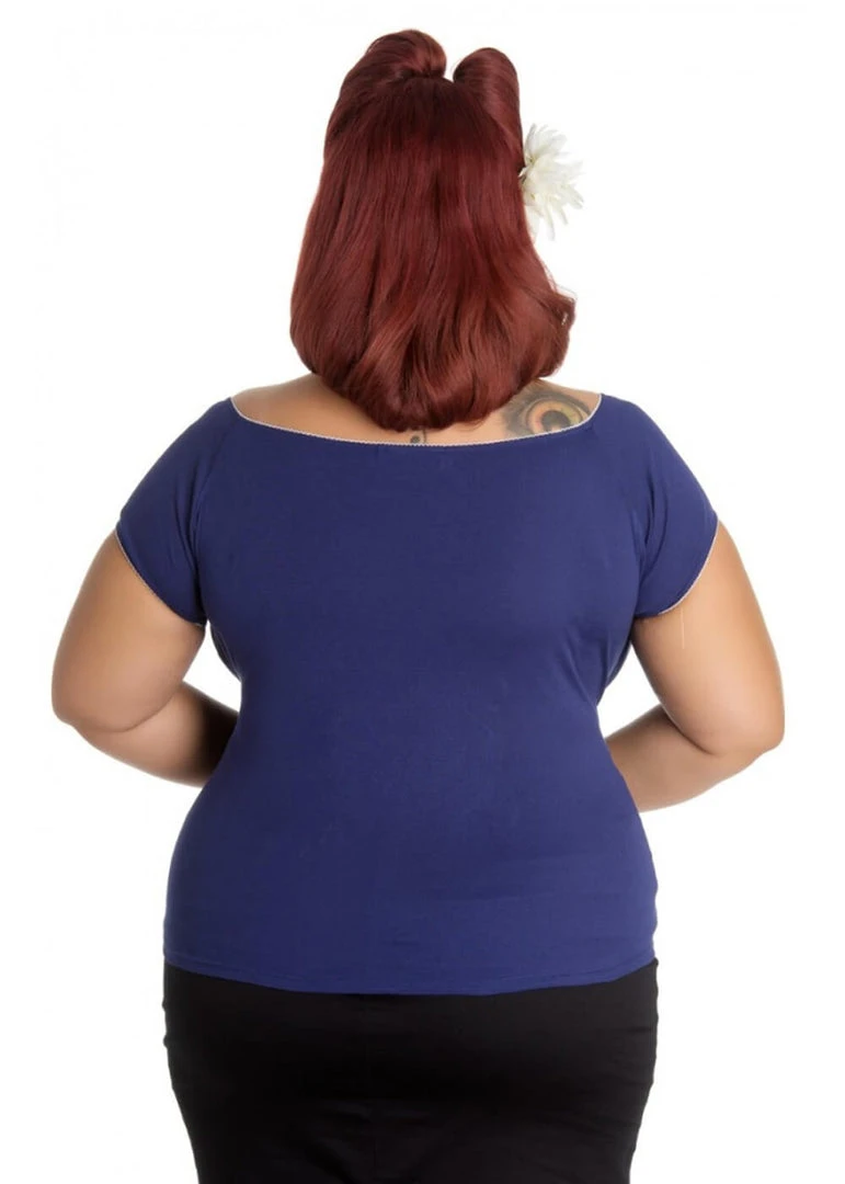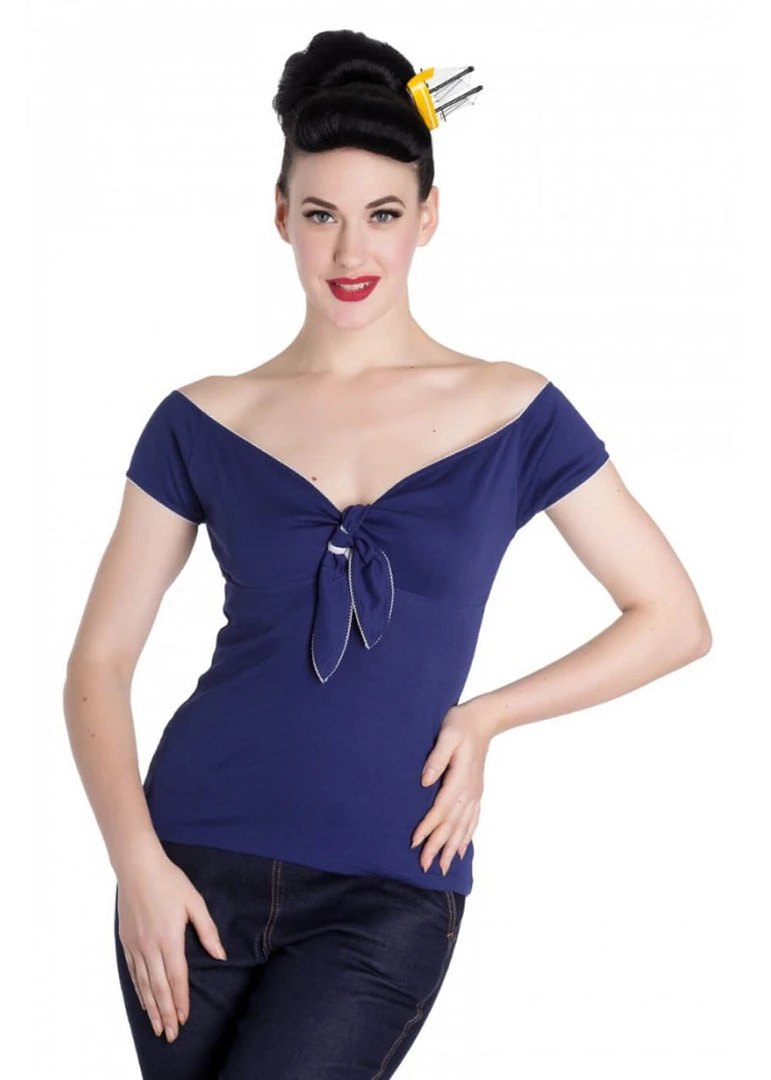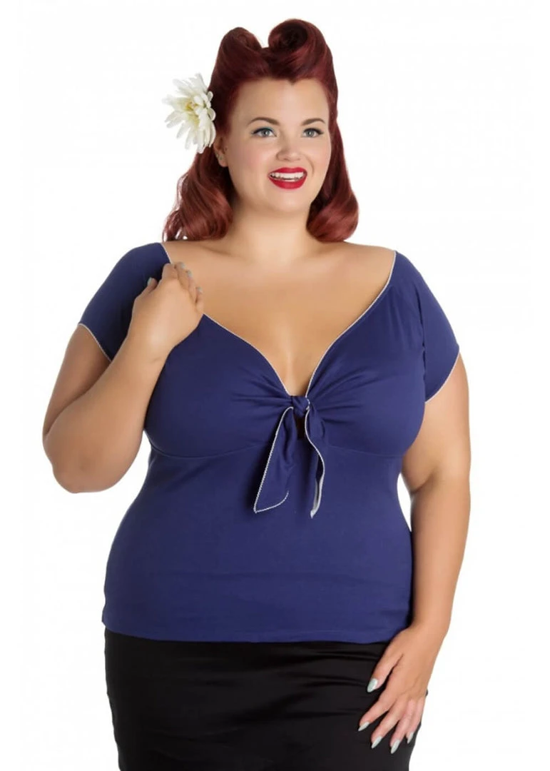 With her lovely bright colour she’s a joy to the eyes, while her soft cotton-mix with a nice stretch feels just as dreamy to wear. Her cut is Vavavoom, with the seductive neckline with bow. Thanks to the wavy edge you don’t show off more than you intend 😉