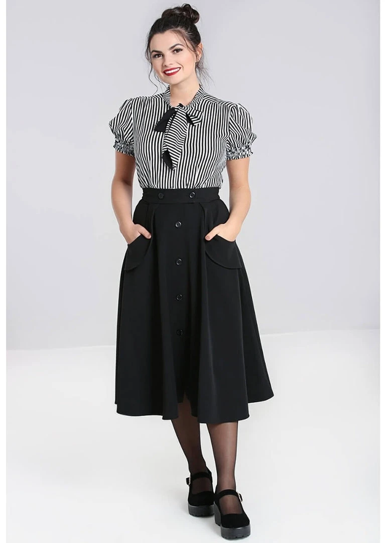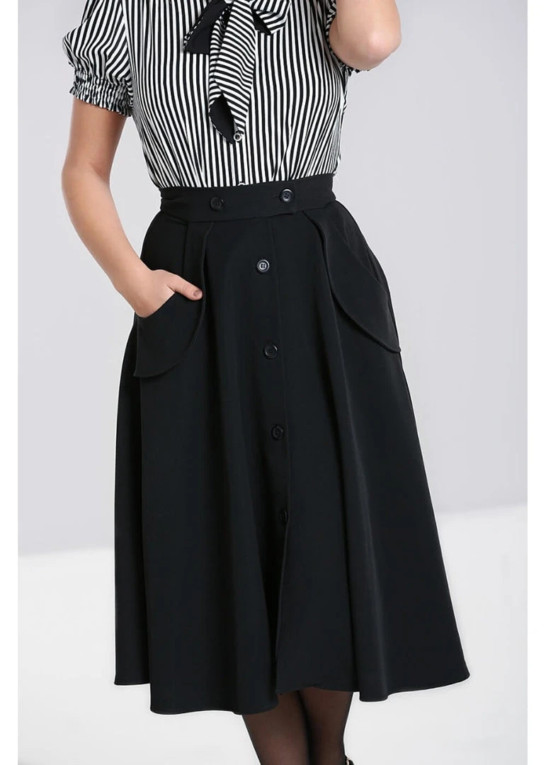 This beauty is made of a soft, smooth fabric, that moves along your steps when you walk, stroll & dance! From the waist with slight stretch, she flares into an elegant skirt with joyfully accentuated pockets. For a height of 1.70m, she ends below the knees and she closes with the buttons in the front, which creates a playful little slit.